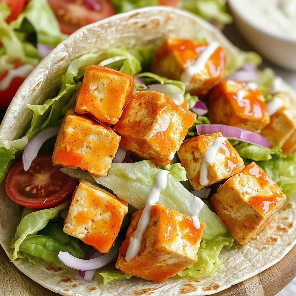 Lay a tortilla flat on a clean surface. In the center, add a layer of shredded lettuce. This keeps the wrap fresh. Next, add the buffalo-flavored tofu on top. Then, sprinkle on diced tomatoes and sliced red onion. If you like, drizzle some vegan ranch dressing for creaminess.