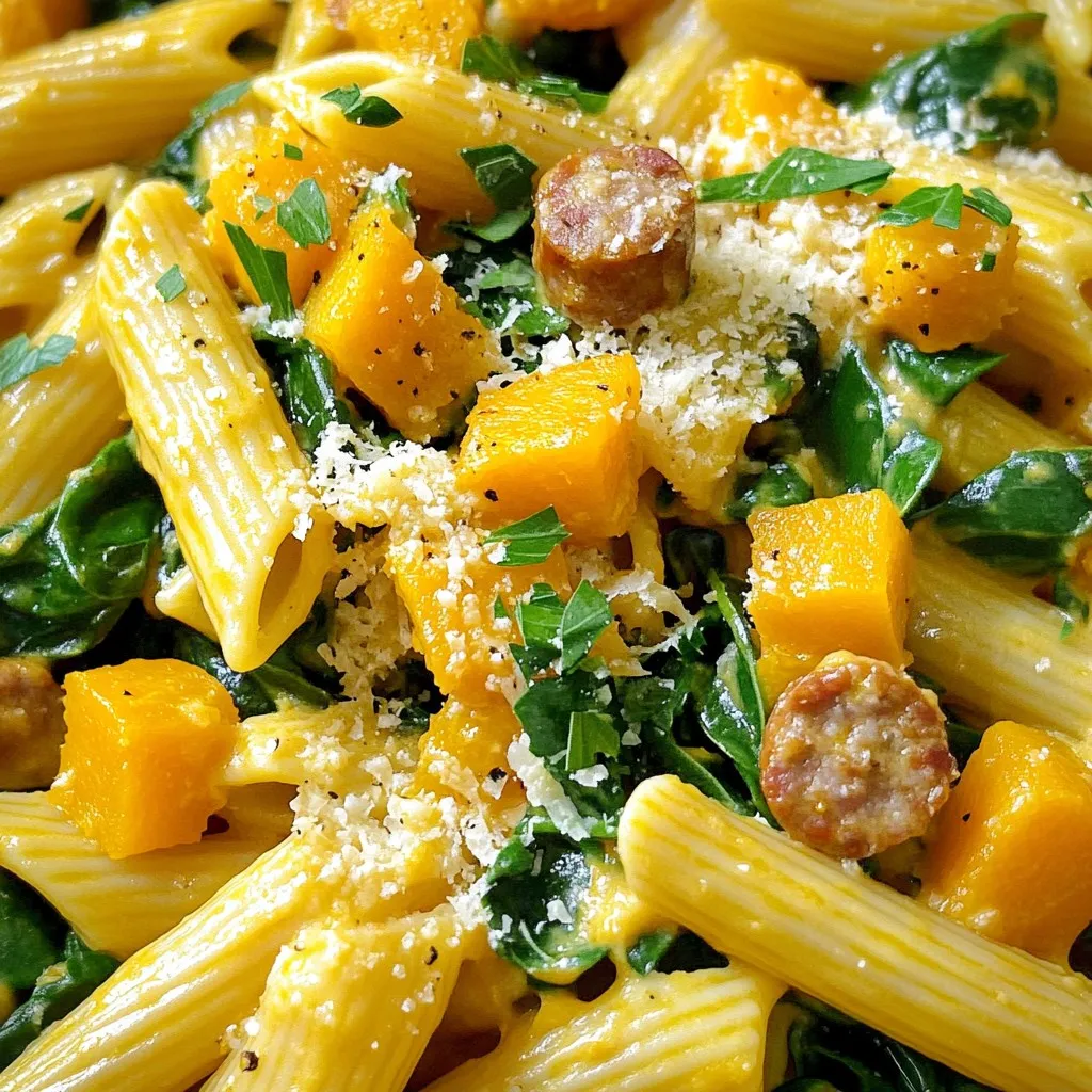 In this recipe, you can choose between penne or fusilli pasta. Both types hold sauces well, making each bite flavorful. For protein, Italian sausage adds richness. You can pick mild or spicy, depending on how much heat you want. The star of this dish is butternut squash. Its sweetness contrasts nicely with the savory sausage. Fresh spinach adds a pop of color and nutrients. Garlic and onion provide a solid flavor base, making every bite delicious.