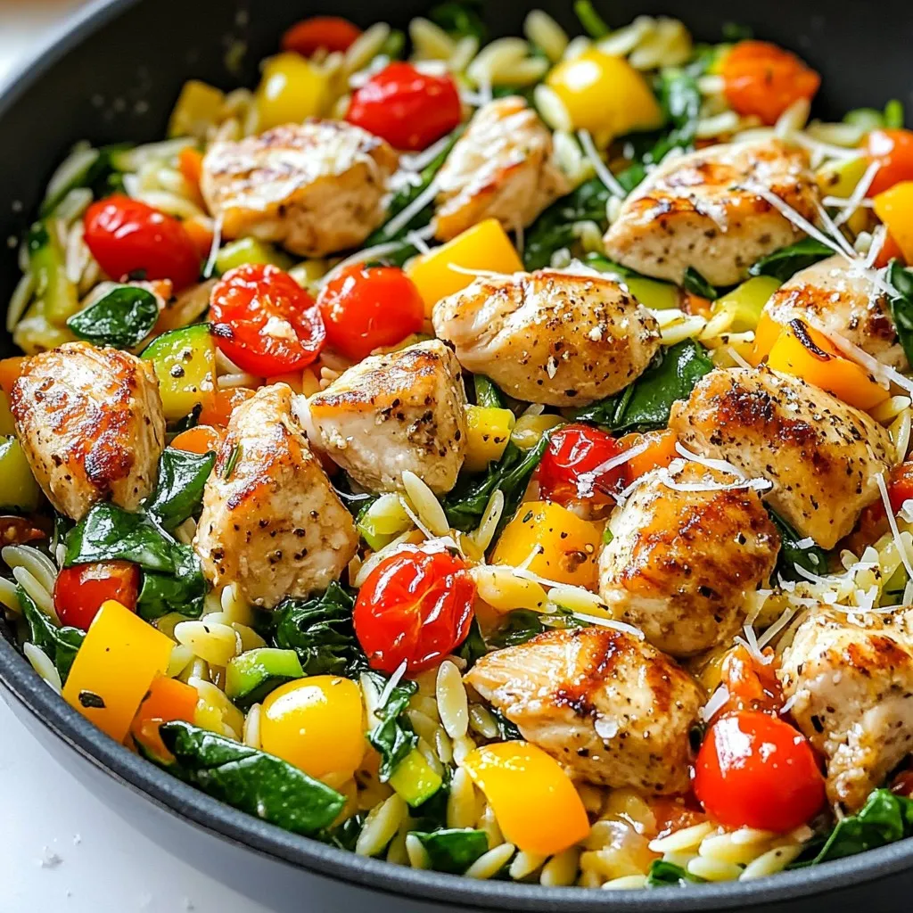 - 2 boneless, skinless chicken breasts, diced into bite-sized pieces - 1 cup orzo pasta - 2 tablespoons balsamic vinegar - 1 cup cherry tomatoes, halved - 1 bell pepper (choose red or yellow), diced - 1 medium zucchini, diced - 2 cups fresh spinach, roughly chopped For this dish, the chicken is the star. It cooks fast and stays juicy. Orzo pasta adds a nice, chewy texture. The balsamic vinegar gives a sweet and tangy kick that brightens the meal. Fresh vegetables like cherry tomatoes, bell peppers, and zucchini add color and crunch. Spinach adds a healthy touch and looks great on the plate. - 1 tablespoon extra virgin olive oil - 1 teaspoon garlic powder - 1 teaspoon dried Italian herbs (like basil and oregano) - Salt and freshly ground black pepper to taste - Grated Parmesan cheese for serving (optional) Olive oil is key for sautéing the chicken. Garlic powder brings a warm flavor that everyone loves. Dried Italian herbs add depth, making each bite flavorful. Don’t forget to season with salt and pepper to enhance all the tastes. If you want to elevate this dish, sprinkle some grated Parmesan cheese on top before serving. It adds creaminess and a savory touch that makes it extra special. {{ingredient_image_2}} First, I heat 1 tablespoon of extra virgin olive oil in a large skillet over medium heat. Once the oil is hot, I add 2 diced boneless, skinless chicken breasts. I season the chicken with a teaspoon of garlic powder, salt, freshly ground black pepper, and dried Italian herbs. I cook the chicken for about 6 to 8 minutes, stirring occasionally. The chicken should become golden brown and fully cooked. After cooking the chicken, I add 1 cup of halved cherry tomatoes, 1 diced bell pepper, and 1 diced medium zucchini to the skillet. I let these cook for about 4 to 5 minutes. This time allows the vegetables to soften and release their tasty juices. Next, I stir in 1 cup of orzo pasta and 2 tablespoons of balsamic vinegar. I make sure to mix everything well to combine the flavors. Then, I carefully pour in 4 cups of water. I increase the heat to bring it to a gentle boil. Once it boils, I reduce the heat to low and cover the skillet. I let it simmer for about 10 to 12 minutes, stirring occasionally, until the orzo is cooked al dente and mostly absorbs the liquid. Once the orzo is cooked, I toss in 2 cups of roughly chopped spinach. I stir until the spinach wilts down. I taste the dish and adjust the seasoning with more salt and black pepper if needed. To serve, I recommend topping it with freshly grated Parmesan cheese for extra flavor. To ensure your chicken cooks evenly, cut it into small, bite-sized pieces. This helps the chicken cook through without drying out. When you sauté it, make sure to move the pieces around in the pan. This keeps them from sticking and helps them brown nicely. For perfect orzo texture, keep an eye on the cooking time. Orzo cooks fast, so check it often. You want it to be tender but still firm to the bite, known as al dente. When you add the orzo to the skillet, stir it well with the other ingredients. This helps it absorb the flavors. You can change up the flavor by trying different seasonings. Instead of garlic powder, try fresh garlic or shallots for a more robust taste. You can also swap dried Italian herbs for fresh herbs like basil or parsley. Both options add a burst of flavor. For extra toppings, consider adding a sprinkle of red pepper flakes for heat. You can also top the dish with freshly chopped herbs, like basil or parsley, for a fresh finish. If you want more texture, add toasted pine nuts or sliced almonds before serving. Pro Tips Marinating Chicken: For enhanced flavor, marinate the diced chicken in balsamic vinegar and herbs for at least 30 minutes before cooking. Vegetable Variations: Feel free to add or substitute vegetables based on seasonality or preference, such as mushrooms or asparagus. Cooking Orzo: Monitor the orzo closely while it cooks; if it absorbs too much liquid, add a splash of water to keep it creamy. Serving Suggestions: Pair this dish with a light salad or crusty bread for a complete meal experience. {{image_4}} You can easily swap the chicken for different proteins. Chicken thighs add more flavor and stay juicy. Rotisserie chicken is an easy choice for a quick meal. If you want a vegetarian option, try using tofu. Cubed tofu soaks up flavors well. Chickpeas are another great choice. They add protein and a nice texture to the dish. Feel free to change up the veggies based on the season. In the summer, use fresh zucchini and bell peppers. In the fall, add butternut squash or Brussels sprouts for a heartier dish. Mixing and matching colors makes your meal pop. Bright vegetables like red, orange, and green look great together. Aim for a rainbow on your plate for both taste and nutrition. If you need gluten-free options, replace the orzo with gluten-free pasta. Look for orzo made from rice or corn. You can also make a low-carb version by using cauliflower rice. This change keeps the dish light but still satisfying. Enjoy the same flavors while staying true to your diet choice. To store leftovers, let the dish cool down first. Place it in an airtight container. This step helps keep out air and moisture, maintaining quality. You can store the Balsamic Chicken Orzo Skillet in the fridge for up to three days. When you're ready to enjoy it again, just reheat it on the stove or in the microwave until hot. If you want to freeze this dish, allow it to cool completely. Then, portion it into freezer-safe bags or containers. Remove as much air as possible before sealing. You can freeze it for up to three months. When you're ready to eat it, take it out of the freezer. Thaw it in the fridge overnight for even heating. To reheat, warm it on the stove or microwave. Add a splash of water if it seems dry during reheating. This helps bring back the creamy texture of the orzo. Can I make this recipe ahead of time? Yes, you can prepare this dish 