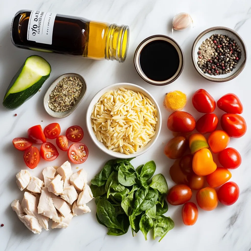 For this dish, the chicken is the star. It cooks fast and stays juicy. Orzo pasta adds a nice, chewy texture. The balsamic vinegar gives a sweet and tangy kick that brightens the meal. Fresh vegetables like cherry tomatoes, bell peppers, and zucchini add color and crunch. Spinach adds a healthy touch and looks great on the plate.