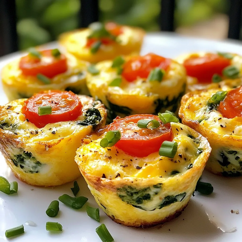 To make these tasty breakfast egg muffins, gather these items: - 6 large eggs - 1/2 cup milk - 1 cup fresh spinach, chopped - 1/2 cup bell pepper, diced (choose any vibrant color) - 1/2 cup cherry tomatoes, halved - 1/2 cup shredded cheese (cheddar or feta for a zesty kick) - 1/4 cup green onions, finely chopped - Salt and pepper to taste - 1 teaspoon garlic powder - 1/2 teaspoon dried oregano - Olive oil spray (for greasing the muffin tin) You can add fun flavors to your muffins! Here are some ideas: - Cooked bacon or sausage for a meaty bite - Mushrooms for an earthy flavor - Zucchini for added veggies - Different cheeses like mozzarella or goat cheese - Fresh herbs like basil or parsley for extra freshness Each muffin packs a nutritious punch. Here are some key facts: - Calories: 120 - Protein: 8g - Fat: 8g - Carbohydrates: 3g - Fiber: 1g - Sugar: 1g These muffins are a great way to start your day! {{ingredient_image_2}} First, preheat your oven to 350°F (175°C). This helps the muffins bake evenly. In a large bowl, crack 6 large eggs. Add 1/2 cup of milk, 1 teaspoon of garlic powder, and 1/2 teaspoon of dried oregano. Sprinkle in salt and pepper to taste. Whisk everything together until it's well mixed and frothy. Next, add 1 cup of chopped spinach, 1/2 cup of diced bell pepper, and 1/2 cup of halved cherry tomatoes. Also, stir in 1/2 cup of shredded cheese and 1/4 cup of finely chopped green onions. Mix gently to spread the veggies and cheese evenly. Take a muffin tin and spray it with olive oil. This keeps the muffins from sticking. Carefully pour the egg mixture into the muffin cavities. Fill each one about 3/4 full. This gives the muffins space to rise without spilling over. Now, place your filled muffin tin in the preheated oven. Bake for 18-20 minutes. The muffins are done when they puff up and a toothpick comes out clean when you poke them. Once baked, take them out and let them cool in the tin for about 5 minutes. To remove them, run a knife around the edges. Then, transfer the muffins to a wire rack to cool completely. Enjoy them warm or store them in the fridge for later! To make your breakfast egg muffins fluffy, use fresh eggs. Fresh eggs help create a light texture. Whisk the eggs and milk until they are frothy. This adds air, which helps the muffins rise. Mix your veggies and cheese gently. Overmixing can make the muffins dense. Fill each muffin cup about 3/4 full. This gives them space to puff up beautifully. To avoid sticking, spray your muffin tin well with olive oil. Ensure you coat every cavity. If you do not have oil spray, use a paper towel to rub oil inside the tin. After baking, let the muffins cool for five minutes. Run a knife around the edges to help release them. This step will save you from messy muffins. These muffins are great for meal prep. You can make a batch and store them in the fridge. Keep them in an airtight container for up to one week. For serving, warm them in the microwave for a quick meal. Pair them with fresh fruit or yogurt for a balanced breakfast. You can also enjoy them cold as a snack. Add chopped green onions on top for a nice touch! Pro Tips Use Fresh Ingredients: Opt for the freshest vegetables and herbs to enhance the flavor and nutritional value of your egg muffins. Customize Fillings: Feel free to experiment with different vegetables, meats, or cheeses based on your taste preferences or what's in your fridge. Batch Cooking: Make a large batch at once for meal prep. These muffins freeze well and can be easily reheated for a quick breakfast. Check for Doneness: Use a toothpick to ensure the muffins are fully cooked. They should be puffed up and the toothpick should come out clean. {{image_4}} If you want a low-carb option, go keto with your egg muffins. Skip the milk and use cream cheese for a creamier texture. Add in crispy bacon bits. Choose green veggies like spinach and zucchini to keep carbs low. You can also swap regular cheese for cream cheese or mozzarella for a rich flavor. These muffins will be filling and tasty while sticking to keto rules. For a veggie twist, focus on colorful ingredients. You can use mushrooms, asparagus, and zucchini. Replace the cheese with a vegan option or skip it altogether. Make sure to add herbs like basil or parsley for extra flavor. This way, you get a healthy and bright breakfast that everyone can enjoy. Want more protein? Add cooked bacon or sausage to your muffins. Just chop the meat into small pieces before mixing it in. This addition gives a nice salty taste and keeps you full longer. You can also use turkey bacon for a leaner choice. Make sure to adjust the salt since bacon can be salty. Enjoy a hearty breakfast with these tasty protein-packed muffins! To keep your breakfast egg muffins fresh, place them in an airtight container. This helps lock in moisture and flavor. Store them in the fridge if you plan to eat them within a week. If you want to keep them longer, consider freezing. Reheating your egg muffins is super easy. You can use the microwave for a quick fix. Place one muffin on a microwave-safe plate and heat for about 30 seconds. Check if it’s warm. If it needs more time, heat in 10-second intervals. You can also use the oven. Preheat it to 350°F (175°C) and warm the muffins for about 10 minutes. This method keeps them fluffy. If you want to freeze your muffins, let them cool completely first. Wrap each muffin in plastic wrap and place them in a freezer-safe bag. This way, they won’t get freezer burn. They can last up to three months in the freezer. When you're ready to eat, thaw them in the fridge overnight, then reheat as mentioned before. Enjoy your tasty, easy breakfast anytime! Yes, you can use egg whites. This will make your muffins lighter. You can mix three egg whites for each whole egg. This swap cuts down on fat. Just remember, muffins may taste less rich. Breakfast egg muffins can last up to one week in the fridge. Store them in an airtight container. This keep