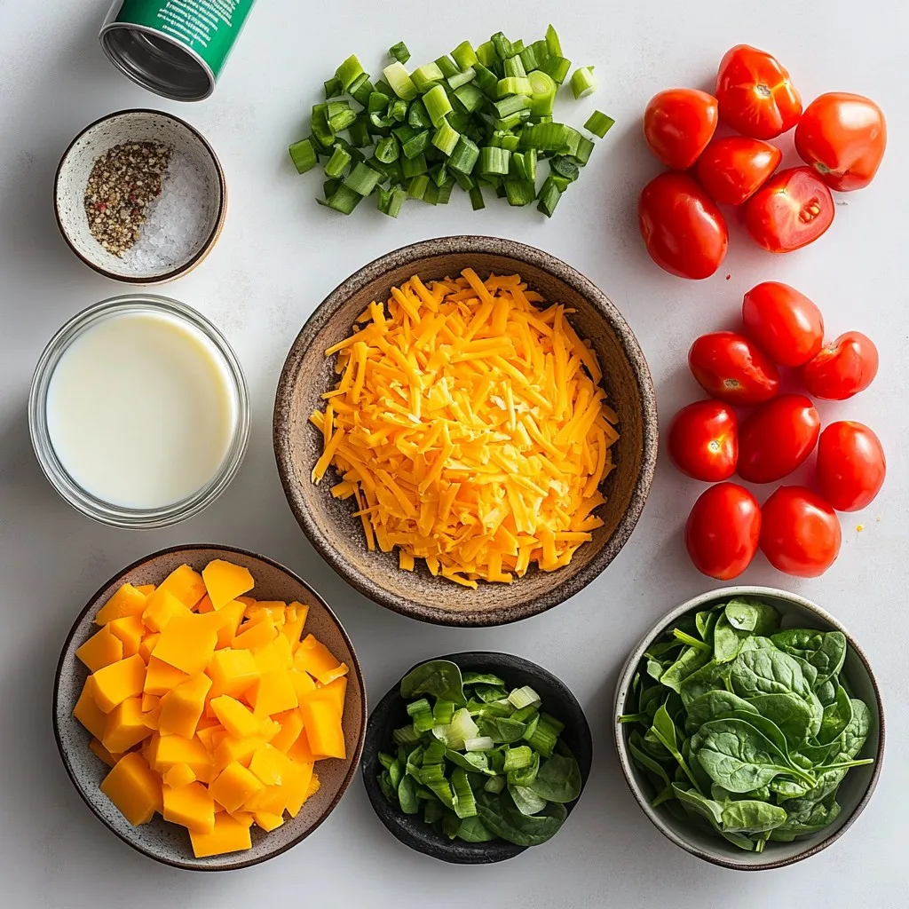 • Stir in the chopped spinach, diced bell pepper, halved cherry tomatoes, shredded cheese, and chopped green onions into the egg mixture. Mix gently to ensure even distribution.