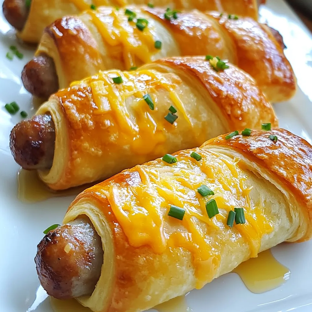 A delightful breakfast treat featuring sausages wrapped in crescent roll dough, topped with cheese and a sweet maple glaze.