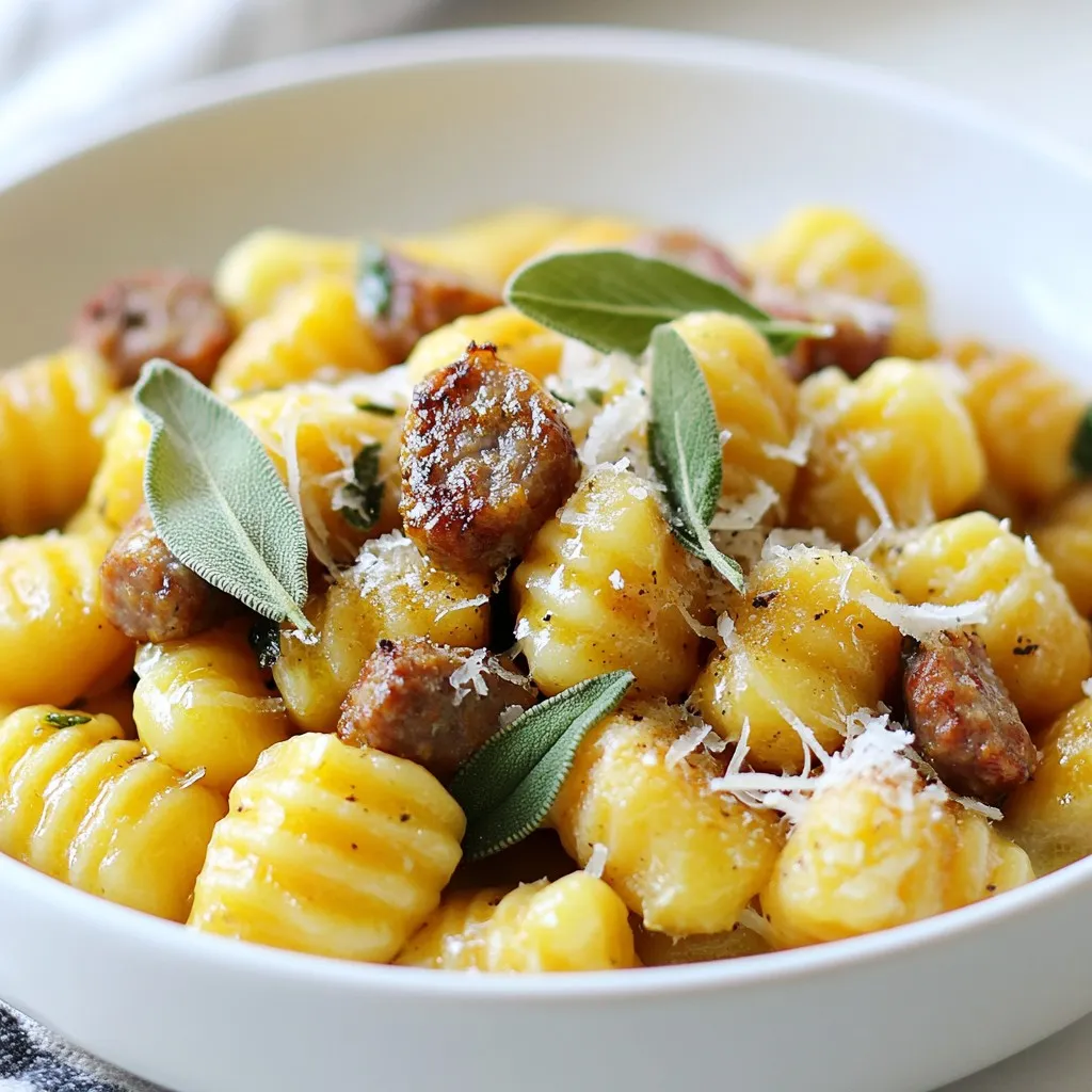 - 2 cups butternut squash, peeled and cut into 1-inch cubes - 1 cup creamy ricotta cheese - 1 pound Italian sausage, casings removed The main stars of this dish are butternut squash, ricotta cheese, and Italian sausage. Butternut squash brings a sweet, nutty flavor. Ricotta adds creaminess, making the gnocchi soft. Italian sausage gives a savory taste that pairs well with the squash. - 2 cups all-purpose flour (plus additional for dusting) - 1 large egg - 1/4 cup fresh sage leaves, roughly chopped - 1/2 cup freshly grated Parmesan cheese All-purpose flour binds the dough, while the egg helps it hold shape. Fresh sage adds a lovely herbal note. Parmesan cheese enhances the flavor with its salty richness. - Sea salt and black pepper - 1 tablespoon extra-virgin olive oil - 1 teaspoon freshly grated nutmeg Seasoning is key. Sea salt and black pepper boost all the flavors. Olive oil coats the squash for roasting. Freshly grated nutmeg adds warmth and depth, lifting the dish from simple to extraordinary. Using these fresh, quality ingredients will make your butternut squash gnocchi with sausage a savory delight. Each component plays a vital role in creating a comforting and delicious meal. Enjoy the process of cooking and the wonderful aromas that fill your kitchen! {{ingredient_image_2}} - Preheat your oven to 400°F (200°C). - Take a baking sheet and line it with parchment paper for easy cleanup. - Place the butternut squash cubes on the sheet. - Drizzle with extra-virgin olive oil, then sprinkle with sea salt and black pepper. - Toss the squash until it is evenly coated. - Roast in the oven for about 25 minutes. - Look for tender squash with a light caramelization on the edges. Roasting brings out the sweetness in the squash. You want it soft and slightly charred for the best flavor. - Grab a large mixing bowl and mash the roasted squash with a fork or potato masher. - Stir in the creamy ricotta cheese until well combined. - Crack in the large egg and add the freshly grated nutmeg. - Mix everything thoroughly to create a smooth mixture. - Gradually add the all-purpose flour, a little at a time. - Keep mixing until the dough forms a soft, workable mass. The dough should not stick too much to your hands. If it feels too sticky, add more flour. - Lightly flour your work surface to prevent sticking. - Take a portion of the dough and roll it into a rope about 1/2 inch thick. - Cut the rope into 1-inch pieces to form gnocchi. - For texture, press the back of a fork against each piece. Shaping the gnocchi is fun and easy. The fork marks help the sauce cling better when you serve them. - How to check dough consistency Your dough should feel soft and smooth. If it sticks to your hands, add a bit more flour. If it feels too dry, you may need a splash of water or an extra egg. - Rolling techniques for even pieces Roll the dough gently into a rope. Aim for about 1/2 inch thick. Use a light touch to keep it even. Cut into 1-inch pieces for uniform cooking. Press a fork on each piece for texture. - Timing for cooking gnocchi and sausage Cook the gnocchi first. It takes about 2-3 minutes in boiling water. Start the sausage while the gnocchi cooks. This way, both will be ready at the same time. - How to avoid water splatter When adding gnocchi to boiling water, drop them in gently. Use a slotted spoon to avoid splashes. This keeps your kitchen clean and safe. - Best garnishes to enhance flavor Top your dish with fresh sage leaves and a sprinkle of Parmesan cheese. A drizzle of olive oil adds richness. Black pepper gives a nice kick. - Recommended side dishes for a complete meal Serve with a light salad or roasted veggies. Garlic bread also pairs well. These sides balance the rich flavors of the gnocchi and sausage. Pro Tips Use Fresh Sage: Opt for fresh sage leaves instead of dried for a more vibrant flavor profile in your dish. Don’t Overwork the Dough: Mix the gnocchi dough just until combined to avoid tough gnocchi. It should be soft and slightly sticky. Test Gnocchi Before Cooking: Boil a small piece of gnocchi first to check the texture. It should float to the top when ready. Customize Your Sausage: Try different types of sausage, such as spicy or sweet, to tailor the dish to your taste preferences. {{image_4}} If you want to switch things up, try using different proteins. Chicken or turkey can replace the Italian sausage. These meats add a lighter taste while keeping the dish hearty. For a vegan option, swap the ricotta cheese with tofu or a vegan cream cheese. Use plant-based sausage to keep the flavor strong without meat. You can change the taste of your gnocchi by adding herbs or spices. Fresh thyme or rosemary works well with butternut squash. Spice it up with crushed red pepper for heat or smoked paprika for depth. Experiment with sauces too. Instead of using a simple drizzle of olive oil, try a creamy Alfredo or a tangy marinara. Each sauce offers a new twist on the dish. Using seasonal vegetables can enhance your gnocchi. In fall, add roasted Brussels sprouts or kale. During spring, fresh peas or asparagus can lighten the meal. You can also adapt this dish for holidays. Serve it with a side of roasted root vegetables for Thanksgiving. Or, top it with toasted walnuts for a festive touch during winter gatherings. To store leftovers, place the gnocchi and sausage in an airtight container. Keep it in the refrigerator. This way, it stays fresh longer. It can last for about three days. Make sure to check for any off smells before eating. Freezing uncooked gnocchi is easy. First, lay the gnocchi in a single layer on a baking sheet. Make sure they don’t touch each other. Freeze them for about one hour. Once frozen, transfer them to a freezer bag. They can last for up to three months in the freezer. To reheat frozen meals, simply place the frozen gnocchi in boiling water. Cook them until they float. This usually takes about 3-5 minutes. For the sausage, heat it in a skillet until hot. Combine them