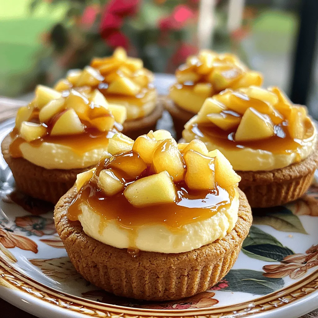 To make these tasty treats, gather the following ingredients: - 1 cup all-purpose flour - 1/2 teaspoon baking soda - 1/4 teaspoon salt - 1/2 cup unsalted butter, softened - 1/3 cup brown sugar, packed - 1/4 cup granulated sugar - 1 teaspoon vanilla extract - 1 large egg - 1/2 teaspoon ground cinnamon - 1/2 cup apple, peeled and finely chopped - 8 oz cream cheese, softened - 1/2 cup powdered sugar - 1/4 cup sour cream - 1/2 teaspoon vanilla extract (for cheesecake) - 1/2 cup caramel sauce (plus extra for drizzling) You can add some extra fun with these optional ingredients: - Chopped nuts, like pecans or walnuts - Extra spices, such as nutmeg or allspice - Chocolate chips for a sweet twist - Different fruits like pears or peaches Make sure you have the right tools to help you: - A standard muffin tin - Mixing bowls (one large and one medium) - Electric mixer for easy blending - Measuring cups and spoons for accuracy - A spoon or spatula for folding ingredients - An oven for baking the cookie cups First, preheat your oven to 350°F (175°C). Grease a muffin tin well to stop sticking. In a bowl, mix 1 cup of flour, 1/2 teaspoon of baking soda, 1/4 teaspoon of salt, and 1/2 teaspoon of ground cinnamon. This will be your dry mix. In another bowl, cream 1/2 cup of softened butter, 1/3 cup of packed brown sugar, and 1/4 cup of granulated sugar for about 2-3 minutes. It should look light and fluffy. Next, add 1 large egg and 1 teaspoon of vanilla extract to the butter mix. Stir well. Now, gently fold the dry mix into the wet mix. Be careful not to overmix. Finally, fold in 1/2 cup of finely chopped apple. In a separate bowl, beat 8 oz of softened cream cheese with 1/2 cup of powdered sugar until creamy. Then, add 1/4 cup of sour cream and another 1/2 teaspoon of vanilla extract. Mix until it’s smooth and silky. This filling will be rich and tasty. Take a tablespoon of cookie dough and press it into the bottom and sides of each muffin cup. Make sure to form a cup shape. Bake in the oven for 10-12 minutes until the edges are golden brown. Once done, let them cool completely in the tin. After cooling, spoon the cheesecake filling into each cookie cup. Drizzle some 1/2 cup of caramel sauce on top. You can add more caramel for a sweet touch. For fun, sprinkle some chopped apples or cinnamon on top for flair. Enjoy your delightful treats! To get the best cookie cup texture, focus on mixing. First, cream the butter and sugars well. This step adds air, making your cups light. After adding the egg and vanilla, mix just until combined. Overmixing can make them tough. When you scoop the dough, press it firmly into the muffin tin. This makes a nice cup shape. Bake until the edges turn golden brown. Let them cool in the tin to keep their shape. For a smooth cheesecake filling, start with softened cream cheese. Use an electric mixer to beat it with powdered sugar. Beat until creamy and smooth, which helps avoid lumps. Adding sour cream makes the filling rich and soft. Remember to mix well after adding the vanilla. This step ensures a silky texture that pairs well with the cookie cups. Serve your cookie cups on a nice plate. Drizzle extra caramel sauce over the top for a sweet touch. Adding a sprinkle of chopped apples gives a nice crunch. For added flavor, dust with ground cinnamon. These little details make your dessert look stunning and taste even better. Enjoy them warm or chilled; both ways are delicious! {{image_4}} You can switch out apples for other fruits. Try pears for a soft texture or berries for a tart twist. Chopped peaches or cherries also bring a sweet freshness. Make sure to adjust the sugar levels if you use tart fruits. This keeps your cheesecake filling balanced and tasty. Not all caramel sauces are the same. You might use salted caramel for a sweet and salty mix. Dark caramel adds depth with a rich flavor. If you want a lighter touch, try butterscotch sauce instead. Each sauce can change the whole vibe of your cookie cups. Spices can bring new life to your cookie cups. Adding nutmeg or ginger gives warmth and a cozy feel. You can also use almond extract for a unique twist. Vanilla is classic, but a splash of maple can add fun. Experiment and find the blend that makes you smile! To keep your Caramel Apple Cheesecake Cookie Cups fresh, store them in an airtight container. Line the container with parchment paper to absorb any excess moisture. This method helps maintain their soft texture and prevents sogginess. In the refrigerator, these cookie cups last about 3 to 4 days. Make sure to keep them sealed well. The flavors deepen as they sit, making each bite even more delightful. If you want to save some for later, freezing is a great option. Place the cookie cups in a single layer on a baking sheet. Freeze them for 1-2 hours until firm. Once frozen, transfer them to a freezer-safe bag or container. They can stay good for up to 2 months. When ready to eat, thaw them in the fridge overnight. Enjoy the deliciousness when you crave a sweet treat! Yes, you can! To make gluten-free cookie cups, use a gluten-free flour blend. This works well in most recipes. Just ensure the blend has a good mix of starches and proteins. Check that all other ingredients are also gluten-free. This way, everyone can enjoy these tasty treats. To prevent sticking, grease the muffin tin well. I recommend using butter or cooking spray. You can also line the muffin cups with paper liners for easy removal. Let the cookie cups cool a bit before taking them out. This will help them firm up and keep their shape. Absolutely! You can make the cheesecake filling a day in advance. Store it in an airtight container in the fridge. When you are ready, spoon it into the cooled cookie cups. This saves time and makes assembly easier. To reheat cookie cups, use an oven set to 350°F (175°C). Place them on a baking sheet for about 5-7 minutes. This warms them without making them soggy. You can drizzle more caramel sauce on top after rehe