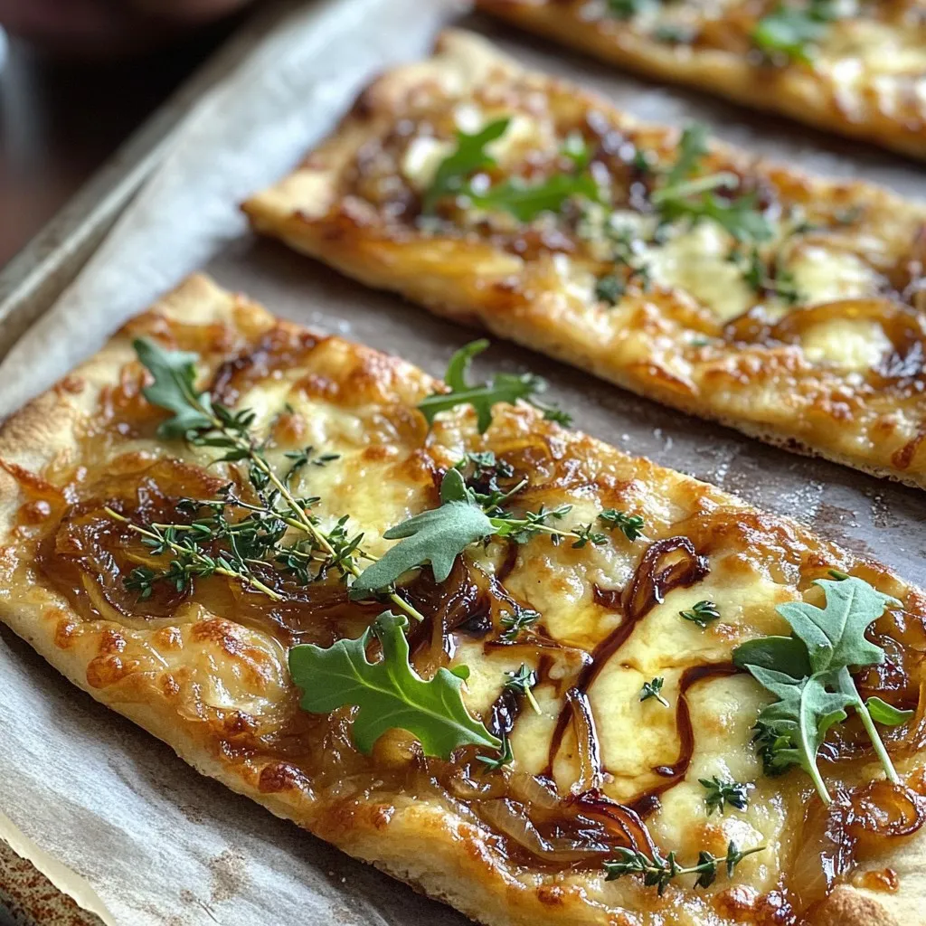 - 1 large flatbread or store-bought pizza dough - 2 large onions, thinly sliced - 2 tablespoons olive oil - 1 tablespoon balsamic vinegar - 1 teaspoon sugar - 1 cup Gruyère cheese, shredded - 1/2 cup fresh arugula - Salt and pepper to taste - Fresh thyme leaves for garnish These ingredients make the flatbread truly special. The flatbread or pizza dough serves as a base. The onions bring sweetness and depth when caramelized. Olive oil helps cook the onions and adds flavor. Balsamic vinegar gives a tangy twist. Sugar aids the caramelization process and enhances the onions' natural sweetness. Gruyère cheese is rich and creamy, melting beautifully on top. Fresh arugula adds a peppery crunch, while thyme leaves give a fragrant finish. Salt and pepper round out the taste, making every bite perfect. Gather these ingredients, and let's create something amazing together! Heating the Skillet Start by heating two tablespoons of olive oil in a large skillet. Set the heat to medium. Wait until the oil shimmers. Adding Onions, Salt, and Sugar Slice two large onions thinly. Add them to the skillet with a pinch of salt and one teaspoon of sugar. Stir the onions well, coating them in the oil. Incorporating Balsamic Vinegar Cook the onions for about 20-25 minutes. You want them soft and golden brown. Near the end, pour in one tablespoon of balsamic vinegar. Stir and let it mix in. Then, take the skillet off the heat. Preheating the Oven If you use pizza dough, check the package for the right oven temperature. Preheat your oven to around 475°F (245°C). If using flatbread, you can skip this step. Rolling Out Pizza Dough If you're using pizza dough, roll it out on a floured surface. Make it as thick as you like. Lining the Baking Sheet Place the rolled dough or flatbread on a baking sheet lined with parchment paper. Ensure it lays flat and evenly. Distributing Onions and Cheese Spread the caramelized onions evenly across the flatbread. Then, sprinkle one cup of shredded Gruyère cheese on top. Cover the onions completely. Baking Time and Indicators Bake the flatbread in the oven for 12-15 minutes. Look for bubbling cheese and a golden-brown edge to know it's done. Final Touches Post-Baking Once baked, take the flatbread out of the oven. Top with half a cup of fresh arugula and a sprinkle of fresh thyme leaves. Add salt and pepper to taste. Temperature Control Keep your heat at medium. This way, onions cook evenly. If the heat is too high, they burn. Low heat can make them take too long. Aim for a steady sizzle. Timing Tips Caramelizing takes about 20-25 minutes. Stir the onions every few minutes. This prevents sticking and ensures they brown well. Watch for a rich, golden color. That’s when they are perfect. Suggested Seasonings Add salt and pepper to taste. You can also sprinkle a bit of sugar. This helps balance the onions' sweetness. A pinch of garlic powder can add depth too. Recommended Pairings Gruyère cheese pairs well with many flavors. Consider serving the flatbread with a side salad. A light arugula salad adds freshness. A drizzle of balsamic glaze also boosts flavor. Serving Suggestions Serve the flatbread on a wooden cutting board. This gives a rustic look. Cut it into squares for easy sharing. Garnishing Ideas Top with fresh arugula after baking. Sprinkle fresh thyme leaves for a pop of color. A small bowl of balsamic glaze on the side is a nice touch. {{image_4}} Substituting Gruyère You can swap Gruyère for other cheeses. Try mozzarella for a milder taste. Cheddar gives a sharp kick. Feta adds a nice tang. Each cheese changes the flavor. Adding Additional Cheeses Mixing cheeses is fun! Blend Gruyère with goat cheese for creaminess. Add Parmesan for a salty touch. Use any cheese you love to create your perfect flatbread. Incorporating Other Vegetables Feel free to add more veggies. Spinach gives a fresh taste. Roasted red peppers add sweetness. Mushrooms bring an earthy flavor. The more colors, the better! Flavor Combinations with Different Herbs Herbs make a big difference. Basil pairs well with onions. Oregano adds depth. Try rosemary for a woodsy taste. Fresh herbs brighten every bite. Alternative Dough Options For a gluten-free flatbread, use gluten-free pizza dough. Cauliflower crust is another great choice. You can even make your own dough with almond flour. Adjustments for Taste and Texture Gluten-free dough may taste different. Add extra seasonings to boost flavor. A sprinkle of garlic powder or onion powder can help. Adjust baking time as needed to get a nice crisp. - Best Storage Practices: Always cool the flatbread to room temperature before storing. This helps prevent sogginess. - Container Recommendations: Use an airtight container or wrap the flatbread tightly in plastic wrap. This keeps it fresh. - Oven vs. Microwave: I recommend using the oven for reheating. The microwave can make it soft. Preheat your oven to 350°F (175°C) for the best results. - Tips for Maintaining Crispiness: Place the flatbread directly on the oven rack or a baking sheet. This helps it stay crispy as it warms. - How Long It Lasts in the Fridge: Properly stored, your flatbread can last about 3-4 days in the fridge. - Signs of Spoilage: Look for any off smells or mold. If it feels slimy, it's best to toss it. Always trust your senses! To get great caramelized onions, start with medium heat. Use a large skillet for even cooking. Add olive oil first, then thinly sliced onions. A pinch of salt helps draw out moisture. Sprinkle in a teaspoon of sugar to boost sweetness. Stir often, allowing the onions to cook for 20-25 minutes. Watch for a rich, golden-brown color. Near the end, add balsamic vinegar for depth. This will give you a sweet and savory flavor. Yes, you can prepare the flatbread ahead of time. You can caramelize the onions and store them in the fridge for up to three days. Roll out the pizza dough or flatbread and keep it covered. When you're ready to bake, just assemble the flatbread with 
