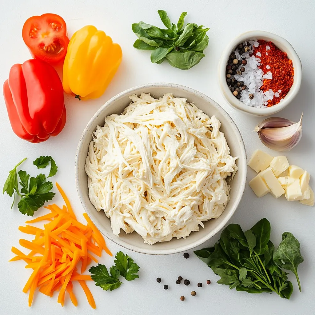 Start by mixing the chicken and cheese in a bowl. You need 2 cups of cooked chicken, shredded. Add 1 cup of shredded mozzarella cheese and 1/2 cup of softened cream cheese. This mix creates a creamy filling.