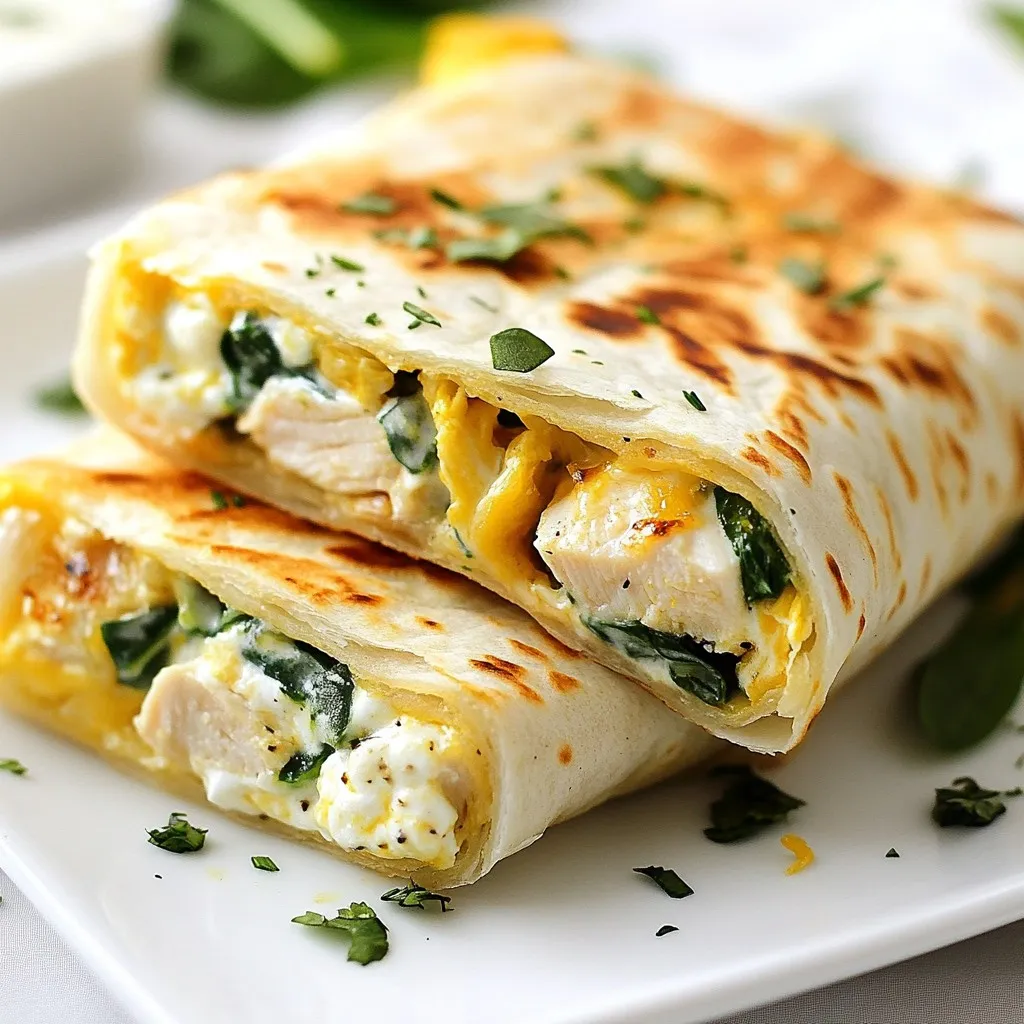 Delicious wraps filled with cheesy chicken, garlic, and fresh spinach, perfect for a quick meal.