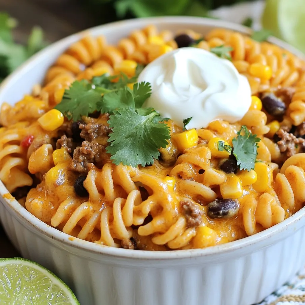 Serve the taco pasta hot, garnished with freshly chopped cilantro. Offer sour cream and lime wedges on the side for extra flavor.