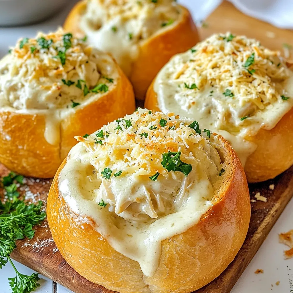 Delicious bread bowls filled with creamy chicken Alfredo, perfect for a comforting meal.