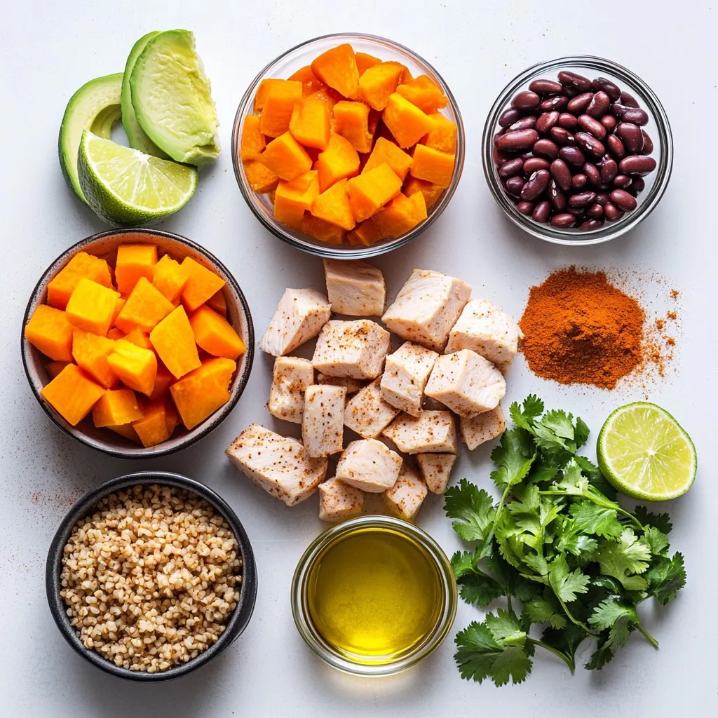 When I make Chicken & Sweet Potato Rice Bowls, I enjoy using fresh ingredients. The chicken breast provides lean protein. Sweet potatoes add natural sweetness and fiber. Brown rice brings a hearty base. Vegetable broth enhances the rice with flavor.