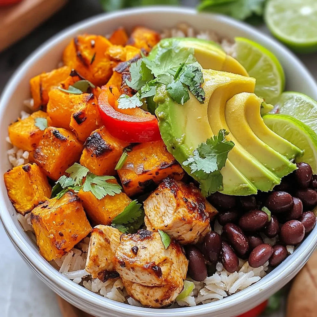 A hearty and nutritious bowl featuring chicken, sweet potatoes, and brown rice, topped with avocado and cilantro.
