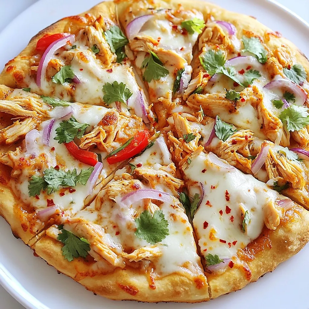 A spicy and flavorful pizza topped with shredded chicken, chili garlic sauce, and fresh vegetables.
