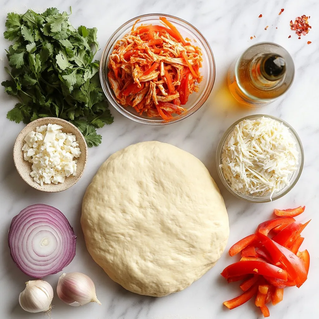 When you gather your ingredients, pick fresh ones for the best flavor. The pre-made pizza dough saves time and effort. You can find it at most grocery stores. If you feel adventurous, you can make your own dough! Shredded chicken is simple. You can use leftover chicken or store-bought rotisserie chicken. The chili garlic sauce adds a bold kick and pairs well with the chicken. Adjust this sauce to fit your spice level.