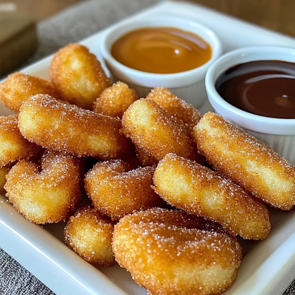Delicious bite-sized churros coated in cinnamon sugar, perfect for dipping in chocolate or caramel sauce.
