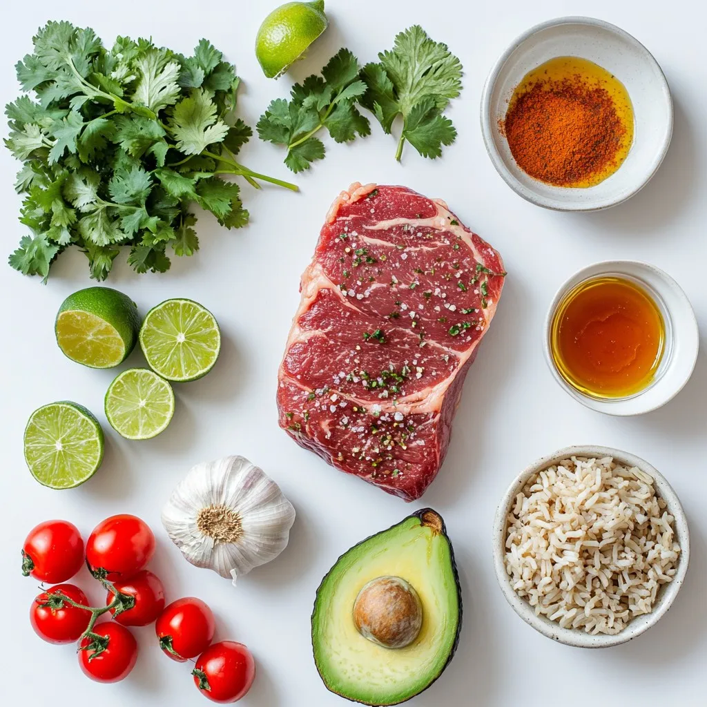 When I make these bowls, I start with the main ingredients. Flank steak gives a rich flavor. The olive oil helps with cooking. Minced garlic adds a great taste. Lime juice brings a fresh zing. The zest adds even more lime flavor.