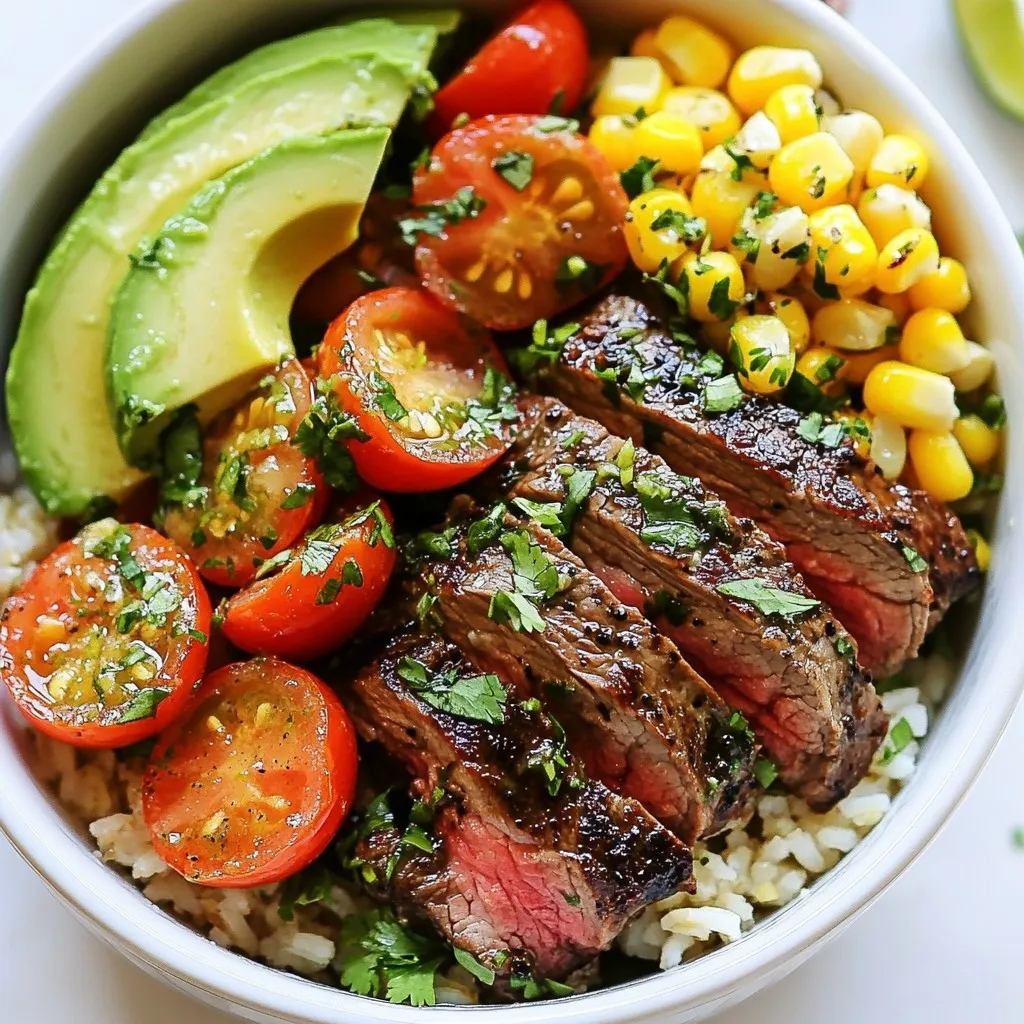 Now, it’s time to build your bowls. Start with 1 cup of cooked brown rice as the base in each bowl. Next, layer the sliced steak right on top. Add halved cherry tomatoes, sliced avocado, and corn. Finally, pile on a generous handful of chopped fresh cilantro. For a zesty kick, squeeze a lime wedge over each bowl. Enjoy every bite of this vibrant meal!