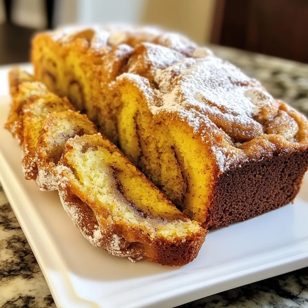 A delightful banana bread with a cinnamon sugar swirl, perfect for breakfast or a snack.