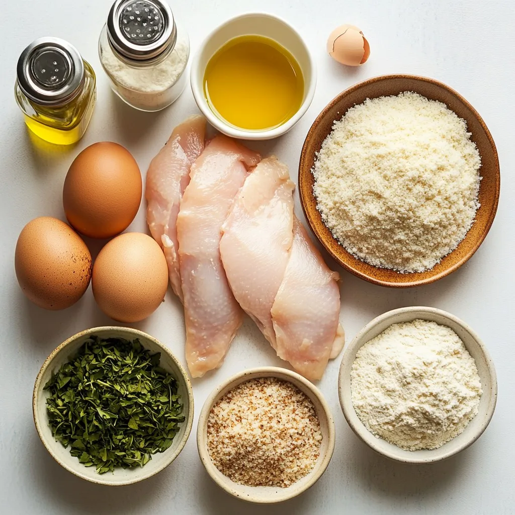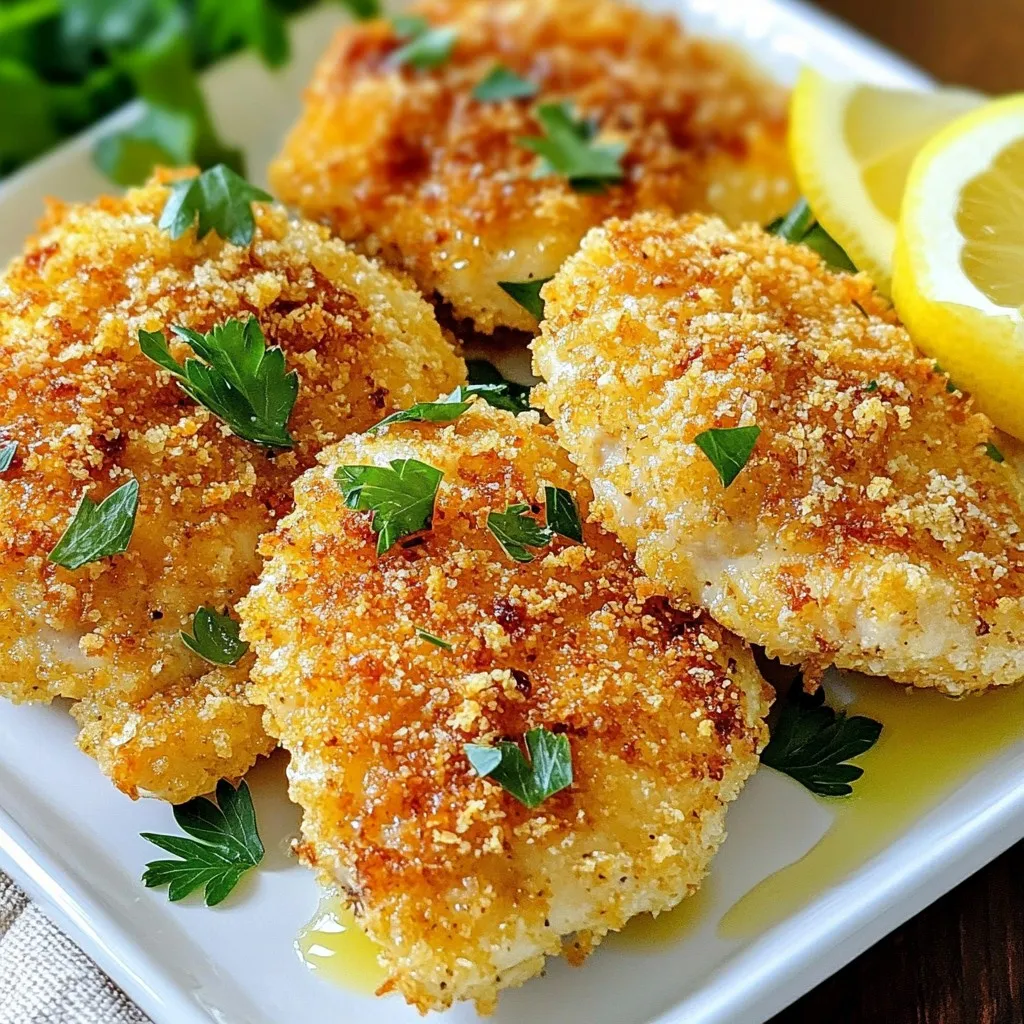 To create your Copycat Parmesan Crusted Chicken, you will need: - 4 boneless, skinless chicken breasts - 1 cup grated Parmesan cheese - 1 cup panko breadcrumbs - 1 teaspoon garlic powder - 1 teaspoon onion powder - 1 teaspoon dried Italian herbs - 1/2 teaspoon black pepper - 1/2 teaspoon salt - 1/2 cup all-purpose flour - 2 large eggs - 2 tablespoons Dijon mustard - Cooking spray or olive oil You'll need a few basic tools: - A baking sheet lined with parchment paper - Shallow bowls for breading - A whisk for mixing eggs and mustard - Tongs for handling chicken If you need to swap ingredients, here are some ideas: - Use chicken thighs instead of breasts for more flavor and moisture. - Substitute regular breadcrumbs for panko if needed, but the texture may change. - For a dairy-free option, try nutritional yeast instead of Parmesan. - If you want less salt, use low-sodium versions of your seasonings. - Replace Dijon mustard with yellow mustard if that's what you have. {{ingredient_image_2}} Start by preheating your oven to 400°F (200°C). This step is key for even cooking. While the oven warms up, line a baking sheet with parchment paper. This will keep the chicken from sticking and make cleanup easier. Now, let’s set up your breading station. In one shallow dish, pour in the all-purpose flour. This will help the egg stick to the chicken. In a second bowl, beat two large eggs with two tablespoons of Dijon mustard until smooth. In another bowl, mix grated Parmesan cheese, panko breadcrumbs, garlic powder, onion powder, dried Italian herbs, black pepper, and salt. Make sure everything is well combined for a tasty coating. Take a chicken breast and dredge it in the flour. Shake off any extra flour. This step helps the egg mix stick better. Next, dip the flour-coated chicken into the egg mixture, letting any excess drip off. Finally, press the chicken into the Parmesan-panko mix. Make sure it’s covered on both sides. Place the breaded chicken on your prepared baking sheet. Repeat this process for all chicken breasts. Once done, lightly spray or drizzle the tops with cooking spray or olive oil. This will help them turn golden and crispy while baking. Bake for 25-30 minutes until the chicken reaches 165°F (74°C) inside. The coating should look golden and crunchy. Let the chicken rest for about 5 minutes before serving. This keeps it juicy and delicious. To get that crunchy, golden crust, use panko breadcrumbs. They create a light and airy texture. Ensure you coat the chicken well in the Parmesan-panko mix. Lightly spray the top with cooking spray or drizzle olive oil before baking. This step helps the coating crisp up nicely in the oven. Bake at 400°F (200°C) for 25-30 minutes for the best results. Juicy chicken comes from proper cooking and resting. Bake until the chicken reaches 165°F (74°C) inside. Use a meat thermometer to check the temperature. Let the chicken rest for 5 minutes after baking. This allows the juices to settle, keeping the meat moist and tender. For a great presentation, serve on a rustic wooden board. You can also use a clean white plate to highlight the colors. Garnish with freshly chopped parsley for a nice touch. Adding lemon wedges on the side gives a bright flavor boost. Pair with a simple salad or roasted veggies for a complete meal. Pro Tips Use Fresh Herbs: Fresh herbs can enhance the flavor of your chicken. If you have access to fresh oregano, basil, or thyme, consider using them instead of dried for a more vibrant taste. Keep the Chicken Cold: For an extra crispy coating, keep the breaded chicken in the refrigerator for about 15 minutes before baking. This helps the breading adhere better during cooking. Check the Temperature: Always use a meat thermometer to ensure your chicken is cooked to the safe internal temperature of 165°F (74°C). This guarantees juiciness and safety. Experiment with Cheese: While Parmesan cheese gives a great flavor, you can mix in other cheeses like cheddar or mozzarella for a unique twist on the classic coating. {{image_4}} You can easily change the flavor of this dish. Try adding different herbs or cheeses. For a fresh taste, use parsley or rosemary. You might also add crushed red pepper for a kick. Swap Parmesan with mozzarella or cheddar for a new twist. Mixing cheeses can create a rich, tasty crust. If you need a gluten-free meal, use gluten-free breadcrumbs instead of panko. Make sure the flour is also gluten-free. Almond flour works well too. For added flavor, mix in some grated Parmesan with the gluten-free breadcrumbs. This keeps the dish crunchy and delicious. Want to spice things up? Add cayenne pepper or chili powder to the breadcrumb mix. You can also mix in some hot sauce with the egg mixture. This will give your chicken a nice heat. Think about serving with a cooling dip like ranch or sour cream. This combo will please anyone who loves heat! To store leftovers, let the chicken cool first. Place it in an airtight container. Keep it in the fridge for up to three days. Make sure to cover it well to keep it fresh. If you used a lot of sauce, store it separately. This helps keep the chicken crispy longer. Reheat the chicken in the oven for the best results. Preheat the oven to 350°F (175°C). Place the chicken on a baking sheet. Cover it loosely with foil to avoid drying out. Heat for about 15-20 minutes or until warm. You can also use the microwave. Just make sure to use a microwave-safe dish. Heat it in short bursts, checking often to avoid overcooking. Freezing is a great way to save your chicken for later. First, let it cool completely. Wrap each piece in plastic wrap tightly. Then place them in a freezer bag. This helps prevent freezer burn. You can freeze it for up to three months. When ready to use, thaw it overnight in the fridge. Reheat as mentioned above for a tasty meal again. Yes, you can use chicken thighs instead of breasts. Thighs offer more fat, which makes them juicy. They also add a deeper flavor t