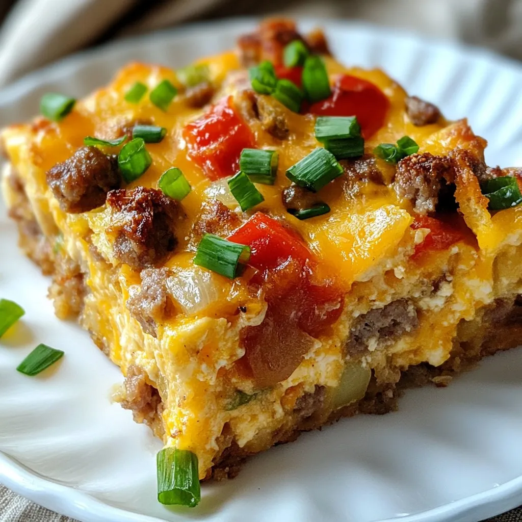 - 1 loaf of crusty bread, cut into 1-inch cubes - 8 large eggs - 2 cups whole milk - 1 cup sharp cheddar cheese, freshly shredded - 1 cup cooked breakfast sausage, crumbled - 1 bell pepper, diced - 1 small onion, finely chopped To make this dish, start with crusty bread. The cubes soak up the egg mixture well. Next, use large eggs for a fluffy texture. Whole milk adds creaminess and richness. Sharp cheddar cheese delivers a bold flavor that melts beautifully. Crumbled breakfast sausage gives the casserole a hearty feel. You can use turkey sausage for a lighter dish. Dice a bell pepper for color and sweetness. Finally, a small onion adds depth to each bite. - 1 teaspoon garlic powder - 1 teaspoon paprika - Salt and black pepper, to taste Seasonings are key to enhancing flavors. Garlic powder adds a savory note. Paprika gives a subtle smokiness and color. Salt and black pepper bring all the flavors together. Don’t skip on these; they elevate the dish. - 2 green onions, sliced Garnish with sliced green onions for a fresh touch. They add color and a mild onion flavor. This step makes the dish look pretty and inviting. For serving, pair each slice with fresh fruit. This adds a bright and refreshing contrast to the rich casserole. {{ingredient_image_2}} 1. Preheat your oven to 350°F (175°C). 2. Take a 9x13-inch baking dish. Grease it with cooking spray or butter. 3. In a large bowl, crack 8 eggs. 4. Pour in 2 cups of whole milk. 5. Whisk them together. Make sure to mix until smooth. 6. Add 1 teaspoon of garlic powder, 1 teaspoon of paprika, salt, and black pepper to taste. 7. Whisk again to combine everything well. 1. Spread 1 loaf of cubed bread evenly in the baking dish. 2. Carefully pour the egg mixture over the bread cubes. 3. Ensure that the mixture soaks the bread evenly. 4. Now, layer 1 cup of crumbled sausage over the bread. 5. Add 1 diced bell pepper and 1 small chopped onion on top. 6. Finish by sprinkling 1 cup of shredded sharp cheddar cheese over everything. 1. Cover the dish with aluminum foil. This helps keep it moist. 2. Bake in the preheated oven for 30 minutes. 3. After 30 minutes, remove the foil. 4. Return the dish to the oven. Bake for another 15-20 minutes. 5. Look for bubbly and golden cheese. 6. To check if it’s done, insert a knife in the center. It should come out clean. 7. Once baked, let it rest for 5 minutes. This helps it set. 8. Garnish with sliced green onions before serving. Cut into squares and serve warm. To make your Crack Breakfast Casserole perfect, ensure even egg distribution. After whisking the eggs and milk, pour the mixture slowly over the bread. This helps the bread soak up the flavors well. You can also use a spatula to gently press the bread down. This way, every piece gets coated. If you want to try alternative cooking methods, consider a slow cooker. Just layer your ingredients as usual, and cook on low for 6 to 8 hours. This method is great for busy mornings. Pair your casserole with fresh fruit. Berries or sliced oranges add a bright note. The sweet and tangy flavors contrast well with the savory casserole. For presentation, serve each slice on individual plates. Sprinkle extra cheddar cheese on top for extra flavor. Adding a few green onion slices as garnish makes it look inviting and fresh. Common issues can happen when making casseroles. One problem is soggy bread. To avoid this, use crusty bread. Let it sit out for a few hours to dry out. If your casserole comes out too dry, you can add a splash of milk before serving. This will help moisten it up. Another option is to cover it with foil during baking. This keeps moisture in while cooking. Pro Tips Use Stale Bread: For the best texture, use bread that is a day or two old. Stale bread absorbs the egg mixture better without becoming too soggy. Mix and Match Ingredients: Feel free to customize the casserole with your favorite ingredients like spinach, mushrooms, or different types of cheese. Make It Ahead: Assemble the casserole the night before and store it in the refrigerator. Just bake it in the morning for a hassle-free breakfast! Let It Rest: Allow the casserole to sit for a few minutes after baking. This helps it firm up, making it easier to cut and serve. {{image_4}} You can make your casserole lighter by using turkey sausage instead of regular sausage. This change cuts down on fat and calories. Another option is to use low-fat milk. This will keep it creamy without the added fat. For a meatless version, try using plant-based sausage. It tastes great and keeps the dish hearty. Adding different veggies can really boost the flavor. Spinach or mushrooms are great choices. They add a nice texture and depth. You can also mix in different cheese. Try using pepper jack for spice or mozzarella for a milder taste. These small changes can make your casserole unique. You can change your casserole with the seasons. In fall, add pumpkin and warm spices like cinnamon or nutmeg. This gives a cozy vibe. In summer, include fresh zucchini and juicy tomatoes. This keeps it light and fresh. Adapting your dish to the season keeps it fun and exciting. To keep your Crack Breakfast Casserole fresh, store leftovers in the fridge. Use airtight containers to prevent air from making it dry. Cut the casserole into squares before storing. This makes it easy to grab a piece later. It will last about 3 to 4 days in the fridge. You can reheat the casserole using two methods: the microwave or the oven. For the microwave, place a square on a microwave-safe plate. Heat it in short bursts of 30 seconds. Check to see if it's warm enough. If you use the oven, preheat it to 350°F. Place the casserole in a baking dish and cover it with foil. Bake for about 15-20 minutes. This helps keep the texture soft and tasty. If you want to freeze the casserole, let it cool completely first. Cut it into squares and wrap each piece tightly in plastic wrap. Place them in a freezer-safe bag or container, removing as much air as possib