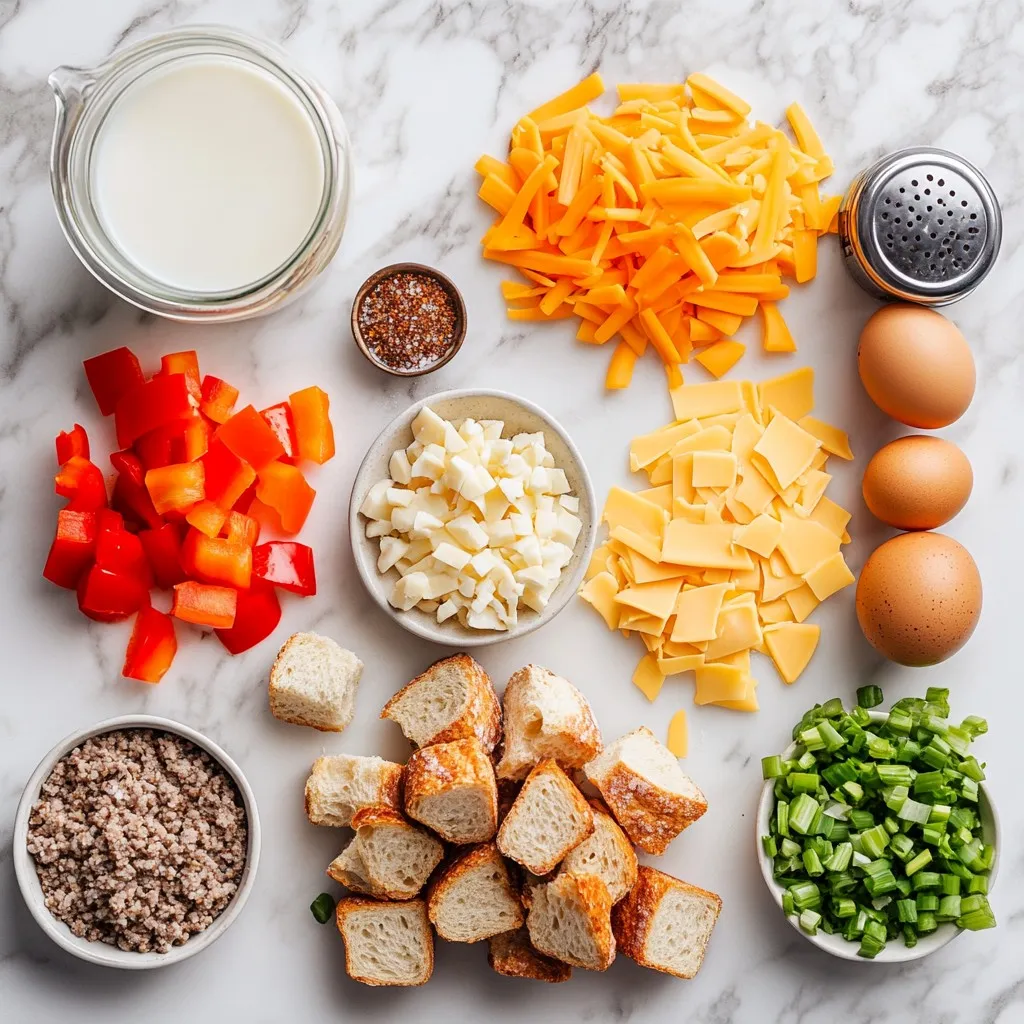 To make this dish, start with crusty bread. The cubes soak up the egg mixture well. Next, use large eggs for a fluffy texture. Whole milk adds creaminess and richness. Sharp cheddar cheese delivers a bold flavor that melts beautifully. Crumbled breakfast sausage gives the casserole a hearty feel. You can use turkey sausage for a lighter dish. Dice a bell pepper for color and sweetness. Finally, a small onion adds depth to each bite.