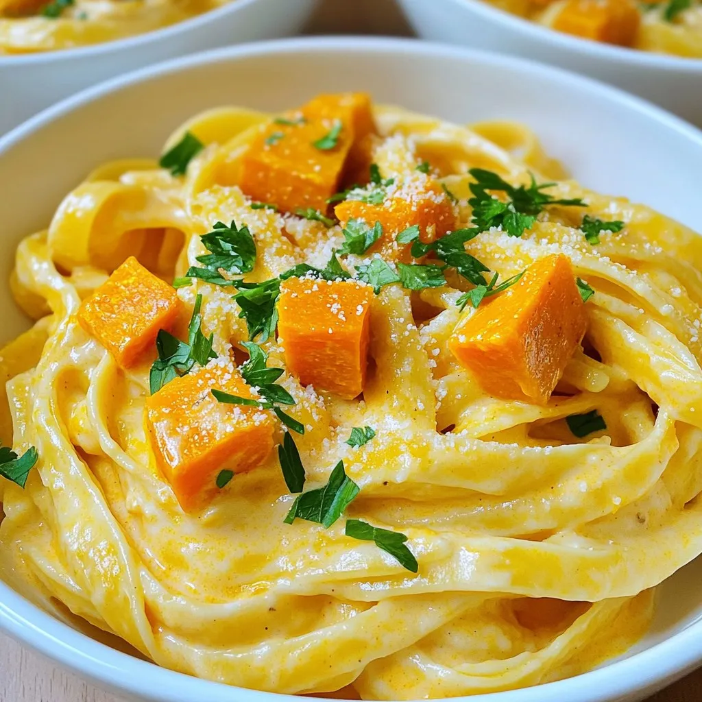 - 8 oz fettuccine pasta - 2 cups butternut squash, peeled and cubed - 1 cup vegetable broth - 1 cup unsweetened almond milk These main ingredients create a rich and creamy base for your sauce. The butternut squash adds a natural sweetness and smooth texture. Fettuccine pasta is perfect for holding the sauce. - 2 tablespoons olive oil - 2 cloves garlic, minced - 1/4 teaspoon nutmeg - 1/4 cup nutritional yeast - Salt and pepper to taste Flavor enhancers elevate the dish. Olive oil gives a nice richness. Garlic adds depth of flavor, while nutmeg brings warmth. Nutritional yeast gives a cheesy taste without dairy. Don’t forget to season with salt and pepper to balance flavors. - Fresh parsley, chopped Garnish makes your dish look vibrant. Fresh parsley adds a pop of color and freshness. It also brings a slight herbal taste that complements the creamy sauce. A simple garnish can really enhance the meal's appeal. - Bring salted water to a boil in a large pot. - Add 8 oz fettuccine pasta and cook until al dente, about 8-10 minutes. - Drain the pasta, saving 1/2 cup of pasta water. Set the pasta aside. - In a medium saucepan, combine 2 cups cubed butternut squash and 1 cup vegetable broth. - Bring to a boil over medium-high heat, then reduce the heat. - Simmer until the squash is fork-tender, which takes about 15-20 minutes. - Carefully transfer the cooked squash and broth into a blender. - Add 1 cup unsweetened almond milk, 2 tablespoons olive oil, 2 minced garlic cloves, 1/4 teaspoon nutmeg, and salt and pepper. - Blend until the mixture is silky smooth and creamy. Taste and adjust seasoning. - Pour the creamy butternut squash mixture back into the saucepan. - Heat over low to medium heat, stirring often. - If the sauce is too thick, add small amounts of reserved pasta water until you reach the desired consistency. - Gently add the cooked fettuccine to the saucepan with the sauce. - Toss the pasta until it’s evenly coated with the sauce. - Allow it to warm through for about one minute to enhance flavors. - Dish out the creamy butternut squash Alfredo pasta onto plates or into shallow bowls. - Garnish with freshly chopped parsley for color and flavor. - Checking for doneness: To know if your pasta is ready, taste a piece. It should be soft but still have a little bite. This is called al dente. - Importance of reserving pasta water: Always save some pasta water before draining. This starchy water helps your sauce stick to the pasta and adds creaminess. - Adjusting thickness and flavor: If your sauce is too thick, add a bit of the reserved pasta water. This helps create a silky texture. For flavor, taste your sauce. Add more salt, pepper, or nutritional yeast as needed. - Tips for blending smoothly: When blending, start at a low speed. Gradually increase the speed to ensure a smooth and creamy sauce. If your blender struggles, add a splash of almond milk to help. - Best practices for storing leftovers: Store leftovers in an airtight container. This keeps the pasta fresh for about 3-4 days in the fridge. - Reheating methods for quality retention: To reheat, add a splash of almond milk to the pasta. Heat it on the stove over low heat, stirring gently. This keeps the sauce creamy and prevents it from drying out. {{image_4}} You can easily change up this recipe with different pasta. Try penne or gluten-free pasta if you prefer. They work just as well and taste great. For the milk, almond milk is a favorite, but you can also use oat or soy milk. Each milk adds its unique flavor. Experiment to find your favorite! Want to boost the protein? Add chickpeas or tofu to your dish. They blend well and keep the meal filling. Spices can also take your pasta to the next level. Add a pinch of cayenne for heat or smoked paprika for a savory twist. These small changes can create a whole new taste. This dish is not just for butternut squash. You can use other seasonal veggies too. Try pumpkin in the fall or zucchini in the summer. Each option offers a fresh taste. Also, think about holidays. For Thanksgiving, add sage or cranberries for a festive flair. For spring, toss in some fresh peas. Each season brings new flavors to explore! To keep your creamy butternut squash Alfredo pasta fresh, use airtight containers. Glass containers are great, but plastic works too. Store the pasta in the fridge for up to three days. This keeps the dish tasty and safe. If you want to freeze the pasta, let it cool first. Then, place it in freezer-safe bags or containers. Squeeze out the air to avoid freezer burn. You can freeze it for up to three months. To enjoy later, thaw it in the fridge overnight. Reheat it in a pan over low heat. Add a splash of almond milk to keep it creamy. Look for signs that the dish has gone bad. If it smells off or has a weird color, toss it. To use leftovers creatively, try mixing the pasta into soups or casseroles. You can also add it to salads for a fun twist. This way, nothing goes to waste! To make this dish vegan, use plant-based milk, like almond milk. The nutritional yeast gives a cheesy taste without any dairy. Olive oil and garlic add richness, making the sauce creamy and flavorful. There are no animal products in this recipe, so it’s perfect for vegan diets. Yes, you can use fresh butternut squash. Just peel and cube it first. Fresh squash gives a bright flavor. If you are short on time, canned squash works too. Both options will make a tasty sauce, but fresh has a bit more texture. This pasta goes well with many sides. Try a simple green salad with a light dressing. Garlic bread is another great choice. You can also serve roasted veggies for color and crunch. If you want more protein, add grilled chicken or chickpeas. To make this dish gluten-free, use gluten-free fettuccine. There are many brands available in stores. Check the ingredients to ensure they fit your needs. You can also use zucchini noodles for a low-carb option. Adjust the cooking time for the noodles if needed. In this blog p