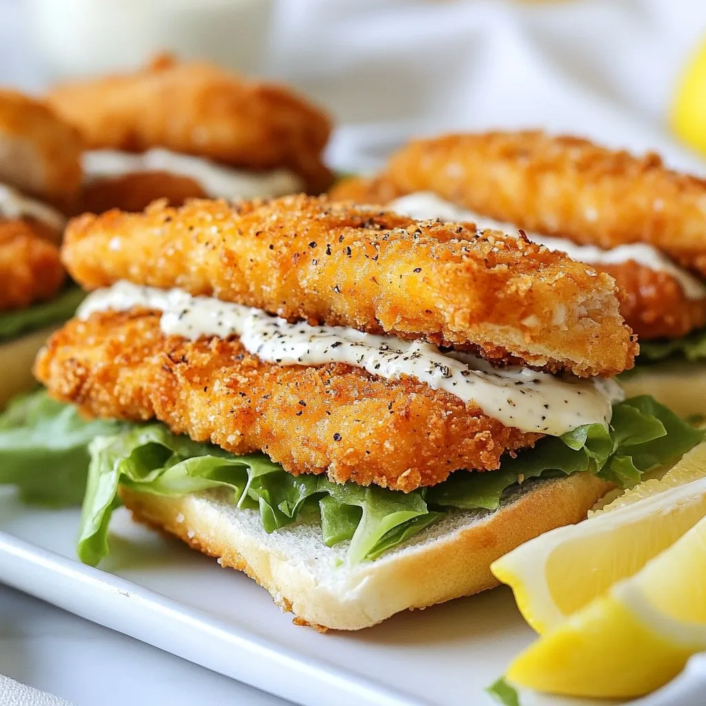 - Chicken breasts - Buttermilk - Panko breadcrumbs - Parmesan cheese - Seasonings (garlic powder, onion powder, salt, pepper) - Sandwich rolls - Romaine lettuce - Caesar dressing - Garnishes (black pepper, lemon wedges) You need the right mix of tasty items to make Crispy Chicken Caesar Sandwiches. Start with chicken breasts. They provide a juicy base. Next, grab buttermilk. Soaking the chicken in buttermilk makes it tender. For crunch, use panko breadcrumbs. They give a nice, crispy texture. Don't forget Parmesan cheese. It adds rich flavor to your breading. You will also need seasonings. Garlic powder and onion powder bring depth. Salt and pepper add warmth. For the sandwich, choose soft sandwich rolls. They hold everything together. Add some romaine lettuce for crunch and freshness. You can use Caesar dressing for that classic taste. Finally, use garnishes like black pepper and lemon wedges. They brighten up each bite. These ingredients come together to make a fantastic lunch. Enjoy mixing and matching flavors! {{ingredient_image_2}} Start by cutting the chicken breasts in half. This makes them thinner and helps them cook faster. Place the chicken fillets in a bowl and add the buttermilk. Make sure the chicken is fully covered. Cover the bowl and refrigerate for at least one hour. You can also marinate it overnight for extra flavor. In a shallow dish, mix the panko breadcrumbs with the grated Parmesan cheese. Add the garlic powder, onion powder, and a pinch of salt and pepper. Stir well to ensure all the seasonings are evenly blended. This mix will give your chicken a nice, crunchy coating. Heat a good amount of oil in a large skillet over medium-high heat. Once the oil is hot, carefully add the breaded chicken fillets. Cook them for about 4-5 minutes on each side until they turn golden brown. Use a meat thermometer to check that the chicken reaches an internal temperature of 165°F. While the chicken cooks, slice the sandwich rolls in half. You can toast them in another skillet or under a broiler if you want. On the bottom half of each roll, spread a tablespoon of Caesar dressing. Place the crispy chicken fillets on top, then add a handful of chopped romaine lettuce. Finish the sandwiches with more Caesar dressing on the lettuce. Sprinkle some freshly cracked black pepper on top. Serve the sandwiches on plates with lemon wedges on the side. The lemon juice adds a nice touch to each bite! Marinating the chicken is key. I suggest soaking the chicken for at least one hour. If you have more time, marinate overnight. This makes the chicken juicy and full of flavor. Pressing the breadcrumbs is very important. When you coat the chicken, press down firmly. This helps the breadcrumbs stick well. A good coat gives you that crispy crunch. Choose a Caesar dressing that you love. A good dressing makes a big difference. You can also try adding spices. A little cayenne pepper or smoked paprika can boost the taste. Consider adding fresh herbs, like parsley or basil. They add a pop of color and flavor. You could also sprinkle some extra Parmesan cheese for richness. Pair your sandwich with crispy fries or a fresh salad. A cold drink, like lemonade, goes great with this meal. For presentation, cut the sandwiches in half. This makes them easier to eat and looks nice on a plate. Add lemon wedges on the side for a zesty touch. Pro Tips Choose the Right Chicken: Opt for organic or free-range chicken breasts for better flavor and texture. Perfectly Crunchy Breading: Double-dip the chicken in buttermilk and breadcrumbs for an extra crispy coating. Let the Chicken Rest: After frying, let the chicken rest for a few minutes to retain its juiciness. Fresh Ingredients Matter: Use fresh romaine and high-quality Caesar dressing for the best flavor in your sandwiches. {{image_4}} You can switch out the chicken for turkey or tofu. Turkey gives a rich taste with fewer calories. It cooks well and stays juicy. Tofu is great if you want a plant-based option. Just press it to remove extra water, then marinate like chicken. Both options keep the sandwich tasty and fun. Adding avocado or bacon can change the game. Avocado makes it creamy and smooth. Try slicing it thin and layering it on top of the chicken. Bacon adds a crispy, salty crunch. Cook it until it’s nice and crispy. You can also experiment with dressings. Instead of Caesar, try ranch or a spicy aioli for a new twist. You can make this sandwich into a wrap or a salad. For a wrap, use a large tortilla. Spread the dressing, add chicken and veggies, then roll it up. It’s easy to grab and eat on the go! For a salad, chop the chicken and mix it with romaine, dressing, and toppings. This way, you enjoy the same great flavors while keeping it light. To keep your Crispy Chicken Caesar Sandwiches fresh, store them properly. Wrap each sandwich in plastic wrap or foil. You can also use an airtight container. Place them in the fridge. They will stay good for about 2 to 3 days. Make sure to separate the chicken from the lettuce and sauce. This prevents soggy bread. When reheating breaded chicken, keep it crispy. Use an oven for the best results. Preheat the oven to 375°F (190°C). Place the chicken on a baking sheet. Heat for about 10 to 15 minutes. This keeps the crust crunchy. You can also use a toaster oven. Avoid the microwave, as it makes the chicken soggy. Freezing is great for meal prep. You can freeze the chicken before cooking. Place the breaded chicken in a freezer bag. Remove as much air as possible. It can last up to 3 months. You can also freeze the cooked chicken. Just let it cool first. For best results, freeze the chicken and rolls separately. Assemble the sandwiches after thawing. You can marinate chicken in buttermilk for 1 hour to overnight. The longer, the better! It makes the chicken juicy and tender. If you're short on time, even an hour will help. Yes, you can prepare many parts ahead. Marinate the chicken the night before. You can also bread the c