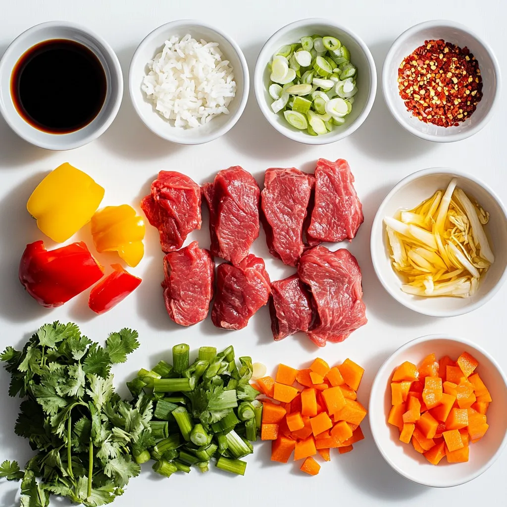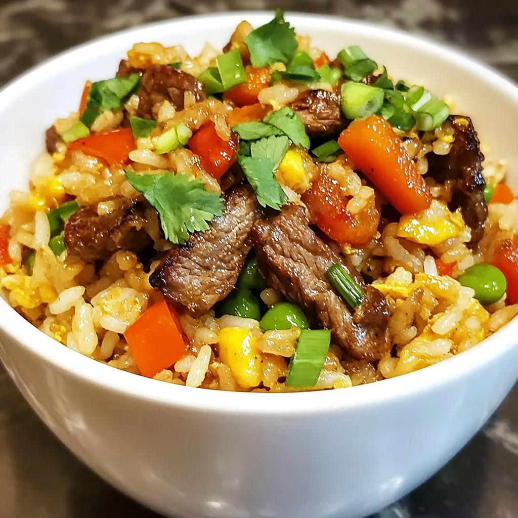 To make crispy chili beef fried rice, gather these main ingredients: - 2 cups of cooked jasmine rice (preferably chilled for at least a few hours or overnight) - 250g beef sirloin, thinly sliced against the grain - 1 bell pepper, diced (any color you prefer) - 1 carrot, peeled and diced - 2 green onions, finely chopped, plus extra for garnish - 3 cloves garlic, minced - 2 tablespoons soy sauce - 1 tablespoon oyster sauce (optional for depth of flavor) - 1 tablespoon chili paste (adjust according to spice level) - 1 teaspoon sesame oil - 2 tablespoons vegetable oil, divided - Salt and black pepper to taste - Fresh cilantro leaves for garnish You can enhance the dish with these optional items: - Additional vegetables like peas or corn for color - A splash of lime juice for a zesty kick - Chopped peanuts for crunch and flavor Choosing fresh ingredients makes a big difference. Here are my tips: - Look for bright bell peppers with smooth skin. - Choose firm carrots without soft spots. - Select fresh green onions that are vibrant and crisp. - For beef, pick sirloin with a bright red color and minimal fat. - Always smell and touch the garlic to ensure it’s fresh and firm. By following these tips, you ensure every bite of your crispy chili beef fried rice is packed with flavor! {{ingredient_image_2}} To marinate the beef, start by slicing 250g of beef sirloin against the grain. This helps keep it tender. In a bowl, mix the beef with a pinch of salt, black pepper, and 1 tablespoon of soy sauce. Stir well and let it sit for about 15 minutes. This step adds flavor and makes the beef juicy. Heat a large skillet or wok over medium-high heat. Add 1 tablespoon of vegetable oil until it shimmers. Carefully place the marinated beef in a single layer. Avoid overcrowding the pan. Sear the beef for 2-3 minutes. You want it crispy and brown. Once done, remove it from the skillet and set it aside. Using the same skillet, add another tablespoon of vegetable oil. When it’s hot, toss in 3 minced garlic cloves. Sauté for about 30 seconds. Be careful not to burn the garlic. Next, add 1 diced bell pepper and 1 diced carrot. Stir-fry for 3-4 minutes. The goal is to keep them tender but slightly crisp. Now, add 2 cups of chilled cooked jasmine rice to the skillet. Use a spatula to break up any clumps. Pour in the remaining soy sauce, 1 tablespoon of oyster sauce (optional), 1 tablespoon of chili paste, and 1 teaspoon of sesame oil. Toss everything together until the rice is coated and heated through. Return the crispy beef to the skillet. Mix it well with the rice and vegetables. Continue stir-frying for 2-3 minutes. This helps blend all the flavors together nicely. Remove the skillet from heat. Gently fold in the chopped green onions. This adds a fresh flavor. Serve the crispy chili beef fried rice in bowls or plates. Garnish with fresh cilantro leaves and more green onions. Enjoy your vibrant and tasty dish while it’s hot! To get that great crispy texture, start with cold rice. Cold rice has less moisture, which helps it fry better. I recommend using jasmine rice and chilling it for a few hours or overnight. When you cook the beef, make sure not to overcrowd the pan. This will help it sear and not steam. Cook the beef in batches if needed. Lastly, let the rice fry for a bit without stirring too much. This will help create those crunchy bits we all love. Using the right tools makes cooking easier and more fun. Here’s what you need: - Large skillet or wok - Spatula for stirring - Bowl for marinating beef - Knife for chopping - Cutting board for prep These tools will help you cook smoothly and achieve great results. If you have leftover crispy chili beef fried rice, it's important to store it well. First, let it cool to room temperature. Then, place it in an airtight container. This keeps it fresh and prevents odors. You can store it in the fridge for up to three days. When reheating, add a splash of water. This keeps the rice moist and helps it heat evenly. Enjoy your tasty leftovers! Pro Tips Use Day-Old Rice: For the best texture, use rice that has been cooked and chilled for at least a few hours or overnight. This helps prevent the rice from becoming mushy when stir-frying. Marinate the Beef: Allow the beef to marinate for at least 15 minutes. This enhances the flavor and tenderness, ensuring each bite is packed with taste. High Heat is Key: Cook the beef and vegetables over medium-high heat. This helps to achieve a crispy texture and vibrant colors in your stir-fry. Customize the Spice Level: Adjust the amount of chili paste according to your preference. You can also add fresh chilies or a dash of hot sauce for an extra kick! {{image_4}} You can easily turn this dish vegetarian. Replace the beef with tofu or tempeh. Use the same marinating steps for the tofu. Cut it into cubes to help it crisp up nicely. Use 2 tablespoons of soy sauce in the marinade for flavor. Keep the vegetables like bell pepper and carrots for texture and color. Add more veggies like peas or broccoli for a healthy twist. Want to try different proteins? Chicken and pork work great in this recipe. For chicken, use thin slices of boneless breast. Marinate it the same way as the beef. For pork, tenderloin or chops sliced thinly are perfect. Cook the proteins until they are crispy and golden. Each protein adds its own flavor, making the dish unique every time. Adjusting the spice level is simple. If you love heat, add more chili paste. You can also include fresh chili peppers for an extra kick. If you prefer less spice, reduce the chili paste or skip it. You can add sweet soy sauce instead, which balances the heat. Customize it to fit your taste, and enjoy your perfect fried rice! To keep your Crispy Chili Beef Fried Rice fresh, place it in an airtight container. Make sure to cool it down to room temperature first. This helps prevent moisture build-up, which can make the rice soggy. Store it in the fridge for up to 3 days. When you store 