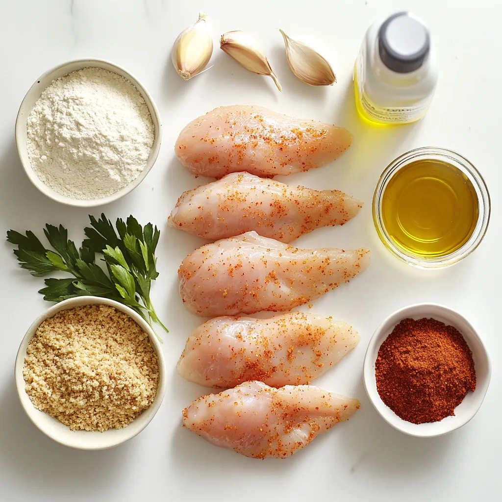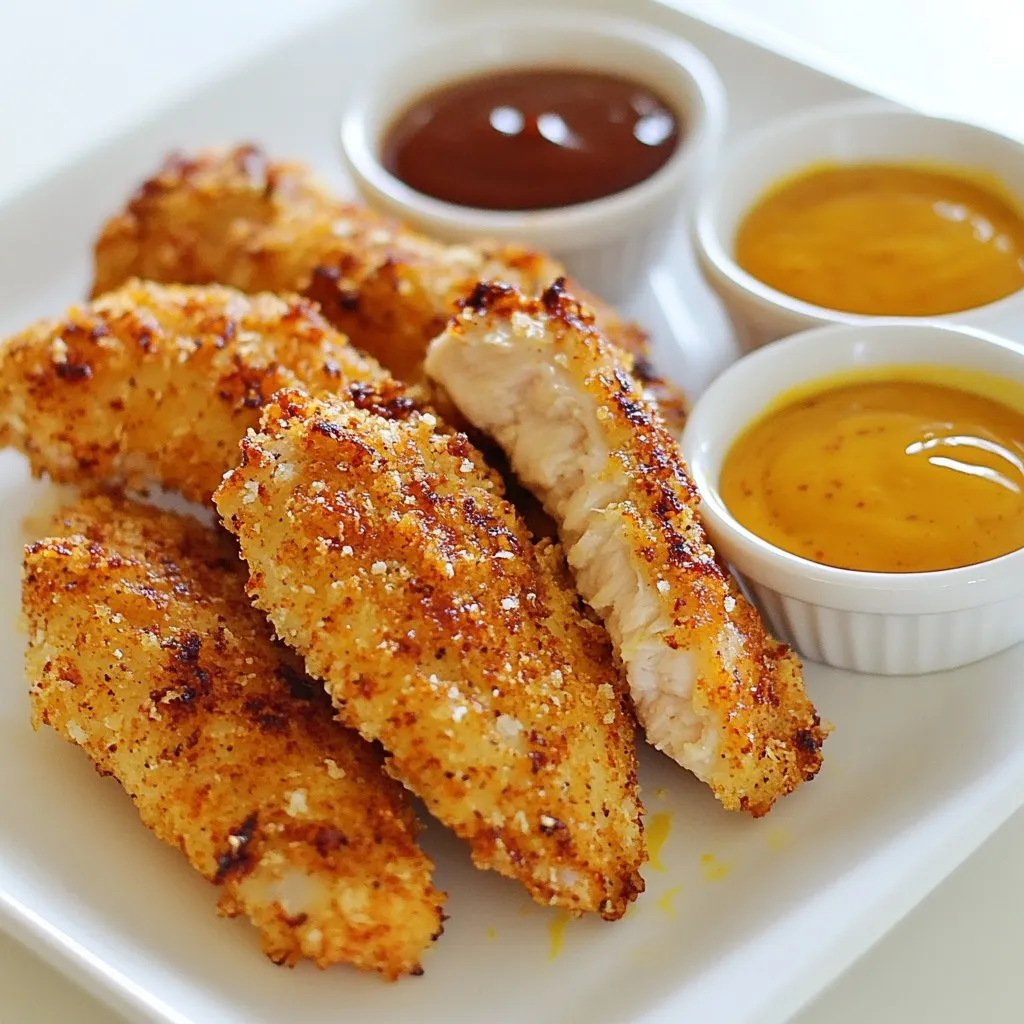 - 1 pound chicken breast tenders - 1 cup buttermilk - 1 cup breadcrumbs (panko recommended) - ½ cup all-purpose flour - 1 teaspoon garlic powder - 1 teaspoon onion powder - 1 teaspoon smoked paprika - ½ teaspoon salt - ½ teaspoon freshly ground black pepper - ¼ teaspoon cayenne pepper (optional) - Cooking spray or olive oil You need fresh chicken breast tenders for this recipe. I use 1 pound, which serves four. Buttermilk is key for flavor and moisture. One cup will do. For that perfect crunch, I recommend one cup of panko breadcrumbs. They create a great texture. Next, you have your seasoning ingredients. You need ½ cup of all-purpose flour. This helps the breading stick. Garlic powder, onion powder, and smoked paprika add great taste. You’ll use 1 teaspoon of each. Don’t forget salt and pepper. They enhance the chicken's flavors. I suggest ½ teaspoon of each. If you like a little heat, add ¼ teaspoon of cayenne pepper. Lastly, you’ll need cooking spray or a drizzle of olive oil. This adds crispiness and helps the tenders brown nicely in the oven. All these ingredients combine to create a delicious meal that everyone will love! {{ingredient_image_2}} First, take the chicken tenders and put them in a bowl. Add the buttermilk to the bowl. Mix well to coat each piece. Cover the bowl with plastic wrap. Place it in the fridge for at least 30 minutes. For the best flavor, marinate up to 2 hours. This step makes the chicken tender and juicy. While the chicken marinates, preheat your oven to 400°F (200°C). Line a baking sheet with parchment paper. In a shallow dish, mix the flour, garlic powder, onion powder, smoked paprika, salt, black pepper, and cayenne pepper. In another dish, pour in the breadcrumbs. This setup helps keep the process smooth. Now, take the marinated chicken out of the fridge. Let the excess buttermilk drip off. Dip each tender into the flour mixture first. Make sure it gets good coverage. Shake off any extra flour. Then, move the tender to the breadcrumbs. Press it gently to coat it evenly. This step ensures every bite is crunchy. Arrange the coated chicken tenders on the baking sheet. Lay them in a single layer. For extra crispiness, lightly spray the tenders with cooking spray. You can also drizzle a little olive oil on top. This helps them brown nicely. Place the baking sheet in your preheated oven. Bake the chicken tenders for 15-20 minutes. They should be golden brown and reach an internal temperature of 165°F (74°C). Halfway through, flip the tenders. This helps them cook evenly and get that perfect crunch. After baking, take the tenders out of the oven. Let them rest for about 3-5 minutes. This resting time keeps them juicy. Serve them warm with your favorite dipping sauces, like honey mustard or barbecue. Enjoy your crispy oven-baked chicken tenders! To get that nice crunch, use panko breadcrumbs. They are lighter and crispier than regular breadcrumbs. A light spray of cooking oil helps the tenders brown evenly. This small step makes a big difference in texture. Marination is key for flavor. I recommend marinating the chicken for at least 30 minutes. For the best taste, let it sit for up to 2 hours. You can also spice up the buttermilk. A pinch of garlic powder or a dash of hot sauce can add exciting layers of flavor. When you place the chicken on the baking sheet, space them out well. This helps them cook evenly and stay crispy. Always check the internal temperature. The chicken should reach 165°F to ensure it is fully cooked. Pro Tips Marinate for Maximum Flavor: Allowing the chicken to marinate in buttermilk for at least 30 minutes helps to tenderize the meat and infuse it with flavor. Panko for Extra Crunch: Opt for panko breadcrumbs instead of regular breadcrumbs to achieve an even crispier texture on your chicken tenders. Don’t Overcrowd the Pan: Arrange the chicken tenders in a single layer on the baking sheet to ensure even cooking and crispy edges. Check for Doneness: Use a meat thermometer to ensure the chicken has reached an internal temperature of 165°F (74°C) for safe and juicy results. {{image_4}} You can easily change the taste of your chicken tenders. If you like spice, try making spicy chicken tenders. Just add more cayenne pepper to the flour mix. This will give your tenders a nice kick. If you prefer a fresh taste, make herb chicken tenders. Add dried herbs like oregano to the breading. This adds a lovely flavor that makes them stand out. If you need a gluten-free option, it's simple! Just swap regular breadcrumbs and flour for gluten-free ones. This way, you can still enjoy crispy chicken tenders without the gluten. Make sure to check the labels to ensure they fit your needs. Baking and frying give different textures. Baked chicken tenders are crisp outside but tender inside. They have less oil, making them a bit healthier. Fried tenders are crunchier and richer in flavor. However, they soak up more oil. Choose baking for a lighter meal, or frying for that classic crunch. Both methods can be delicious! - Store in an airtight container. - Keep in the refrigerator for up to 3 days. After enjoying your crispy oven-baked chicken tenders, you might have some left. To keep them fresh, place the leftovers in an airtight container. This helps to lock in flavor and moisture. You can enjoy them within three days. If you wait too long, they may lose their taste and texture. - Freeze cooked tenders for longer storage. - Reheat in oven for crispiness. If you want to save your chicken tenders for later, freezing is a great option. To do this, place the cooked tenders in a freezer-safe bag or container. Make sure to remove as much air as possible. You can freeze them for up to three months. When you're ready to eat, just reheat them in the oven. This keeps them crispy and tasty. - Reheat in the oven to maintain crispiness. - Avoid microwave to prevent sogginess. When it's time to enjoy your chicken tenders again, use the oven for reheating