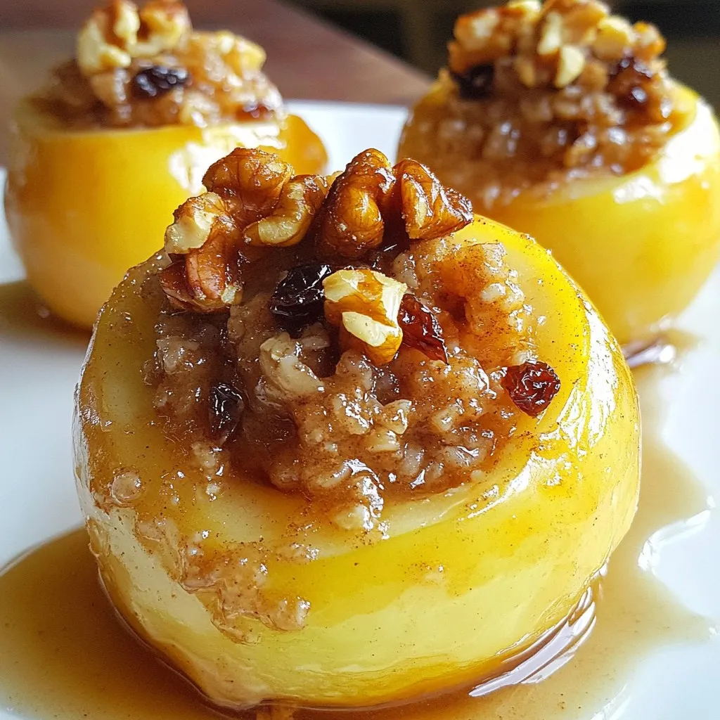 To make Easy Baked Apples, gather these simple ingredients. They create a warm and sweet treat. - 4 medium-sized Granny Smith apples - 1/2 cup rolled oats - 1/4 cup packed brown sugar - 1 teaspoon ground cinnamon - 1/4 cup chopped walnuts (or pecans) - 1/4 cup raisins (or dried cranberries) - 1/4 cup unsalted butter, melted - 1/2 cup apple juice or water (for baking) - A pinch of salt Each item plays a key role in the taste and texture. The Granny Smith apples bring a nice tartness. The oats and brown sugar create a sweet and chewy filling. Cinnamon adds warmth and spice. Nuts give crunch, while raisins or cranberries add a fruity touch. Butter binds it all together, adding richness. Finally, the apple juice or water ensures the apples stay moist while baking. With these ingredients, you can make a delightful dessert. {{ingredient_image_2}} First, you need to preheat your oven to 350°F (175°C). This prepares it for our tasty baked apples. Next, take four medium-sized Granny Smith apples. Use an apple corer or a sharp knife. Carefully remove the core, but keep the bottom intact. This creates a pocket for our sweet filling. In a medium bowl, combine the filling ingredients. Add 1/2 cup of rolled oats, 1/4 cup of packed brown sugar, and 1 teaspoon of ground cinnamon. Toss in 1/4 cup of chopped walnuts or pecans, and 1/4 cup of raisins or dried cranberries. Pour in 1/4 cup of melted butter and a pinch of salt. Mix everything well until it forms a cohesive blend. Now, take spoonfuls of your oat mixture. Gently pack the filling into each cored apple. Make sure to fill them generously. This step is key for great flavor in every bite. Arrange the stuffed apples upright in a baking dish. Pour 1/2 cup of apple juice or water into the bottom of the dish. This liquid helps create steam during baking, keeping the apples moist and tender. Cover your baking dish with aluminum foil. This keeps moisture in. Bake the apples for 25 minutes. After this, remove the foil. Bake for another 15 to 20 minutes. The apples should be tender and the filling golden brown. Once your apples are done baking, let them cool for a few minutes. This step helps avoid burning your mouth on the hot filling. Enjoy your delightful dessert! For this recipe, I recommend using Granny Smith apples. They are tart and firm, making them perfect for baking. Their shape holds well in the oven, and they balance the sweetness of the filling. Other good options include Honeycrisp or Fuji apples, which add a nice, sweet flavor. You can prepare these baked apples a day before serving. Stuff the apples and store them in the fridge. When ready to bake, just add the liquid and pop them in the oven. This saves time and allows the flavors to meld together. For a special touch, serve the baked apples warm. I love to drizzle the sweet juices from the baking dish over the apples. Add a scoop of vanilla ice cream or a dollop of whipped cream for a creamy contrast. You can also sprinkle some extra nuts or cinnamon on top for added flavor. Enjoy this delightful dessert! Pro Tips Choose the Right Apples: For the best flavor and texture, opt for tart apples like Granny Smith, which hold up well during baking and complement the sweetness of the filling. Experiment with Nuts: Feel free to swap walnuts for pecans or even almonds for a different taste and texture. Each nut brings its unique flavor that enhances the dish. Enhance the Filling: Add a splash of vanilla extract or a pinch of nutmeg to the filling mixture for an extra layer of flavor that elevates your baked apples. Serve with a Twist: Instead of traditional ice cream, try serving with a scoop of cinnamon or caramel ice cream for a delightful twist on this classic dessert. {{image_4}} You can change the nuts for more flavor. Instead of walnuts, try pecans or almonds. Each nut gives a new taste. You can also add seeds for crunch, like sunflower or pumpkin seeds. For dried fruits, you have many options. Raisins work well, but dried cranberries add tartness. Apricots or figs can give a sweet touch. Mix and match to find your favorite flavor combo! If you need gluten-free options, use gluten-free oats instead of regular rolled oats. They work just as well. Check the labels to ensure they are safe for your diet. For a vegan treat, swap the butter for coconut oil or a plant-based butter. You can replace apple juice with almond milk or water. The dessert stays tasty and friendly for all diets! To store leftover baked apples, let them cool down completely. Place them in an airtight container. You can keep them in the fridge for up to three days. If you want to keep them longer, you can freeze them. Just make sure to wrap them tightly in plastic wrap or foil before putting them in a freezer bag. This way, they will stay fresh and tasty. When you are ready to enjoy your baked apples again, you have a few easy options. If you want to reheat them in the oven, preheat it to 350°F (175°C). Place the apples in a baking dish and cover them with foil to keep them moist. Heat for about 10-15 minutes. You can also use the microwave. Put one apple on a microwave-safe plate and heat for about 30 seconds to 1 minute. Check if it is warm enough before enjoying it. Yes, you can use other types of apples. I like Fuji or Honeycrisp apples. They are sweet and hold up well when baked. Just make sure the apples are firm. Soft apples may turn mushy. Baked apples last about 3 to 5 days in the fridge. Store them in an airtight container. You can enjoy them warm or cold. Reheat them in the microwave for a quick treat. Yes, you can freeze baked apples. Let them cool completely first. Wrap each apple in plastic wrap. Place them in a freezer-safe bag. They can last up to three months in the freezer. Baked apples taste great with vanilla ice cream. You can also add whipped cream for extra flavor. Drizzle some caramel sauce on top for a sweet touch. Try serving with granola for a crunchy bite! This blog post covered how to make bake