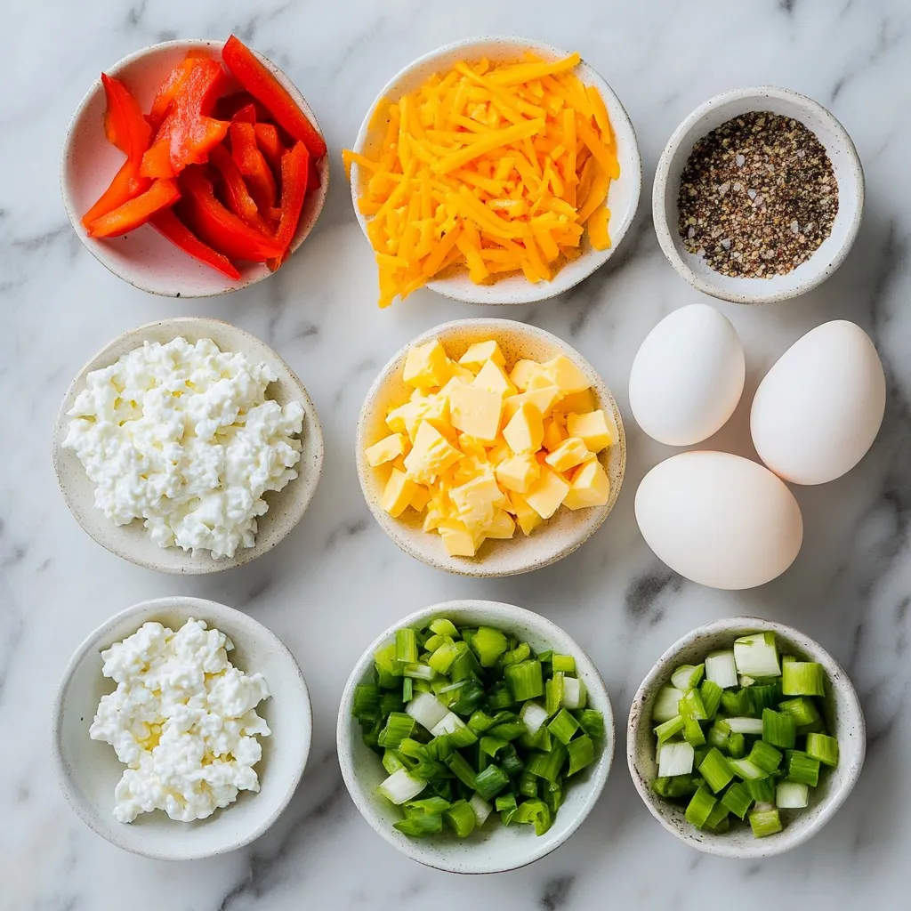 To make Fluffy Cottage Cheese Egg Muffins, gather all your ingredients first. You need six large eggs to form the base. Next, get one cup of small curd cottage cheese. This adds creaminess and protein to the muffins.