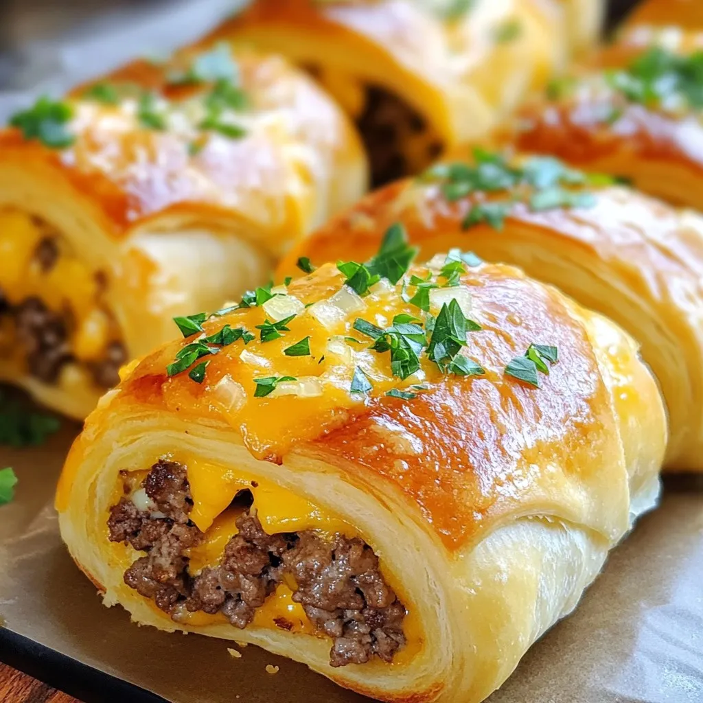 Delicious cheeseburger filling wrapped in crescent roll dough and brushed with garlic butter.