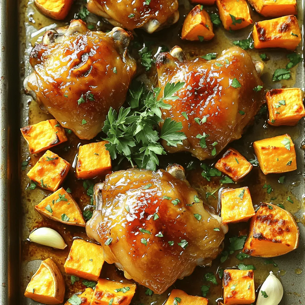 For a rustic look, serve the chicken and sweet potatoes right from the sheet pan. This adds charm to your meal. Drizzle any leftover pan juices over the dish for extra flavor. If you like, you can create individual plates. Top with fresh parsley for a pop of color. This step makes the dish look even more appealing. Enjoy the burst of flavors in every bite!