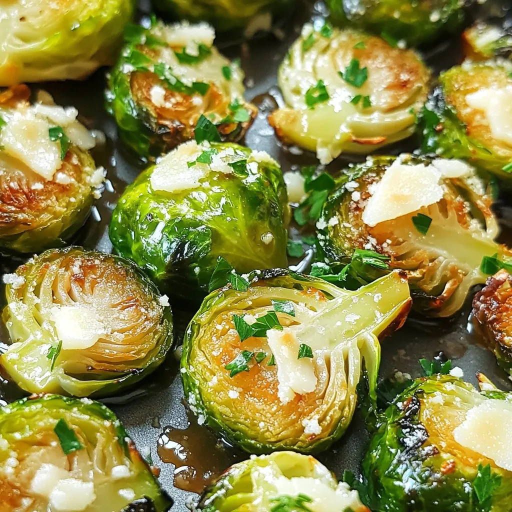 A savory dish featuring Brussels sprouts roasted to perfection with garlic and Parmesan cheese.