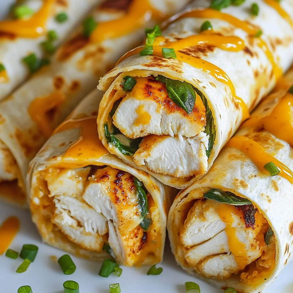 Delicious wraps filled with gooey cheese, tender chicken, and fresh vegetables, perfect for a quick meal.
