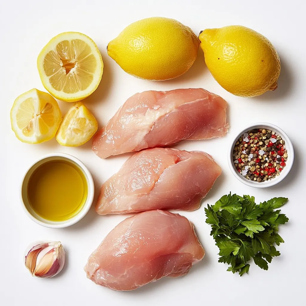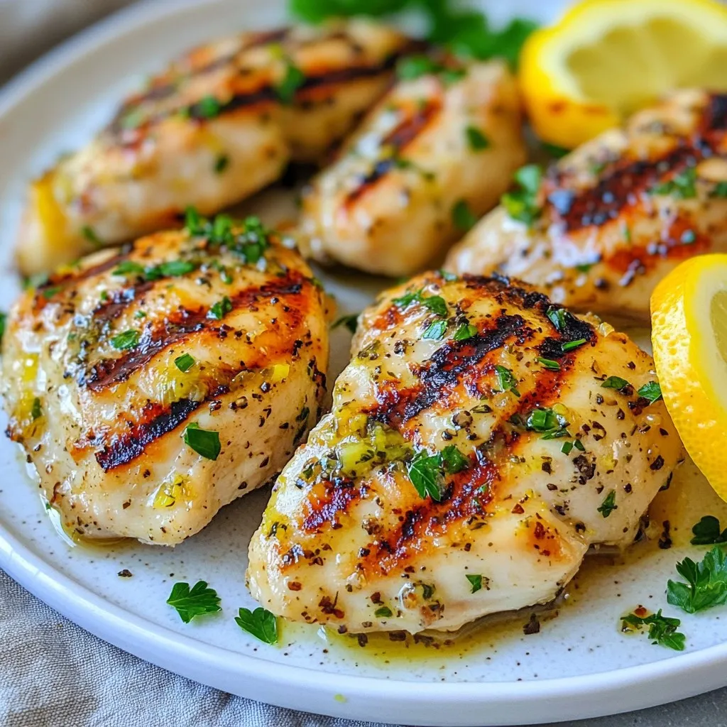 - Chicken - 4 boneless, skinless chicken breasts - Marinade Components - 3 lemons (zested and juiced) - 1/4 cup extra virgin olive oil - 4 cloves garlic, minced - 1 tablespoon dried oregano - 1 teaspoon salt - 1 teaspoon freshly ground black pepper - 1/2 teaspoon red pepper flakes (optional for heat) - Garnishing Elements - 1/4 cup fresh parsley, finely chopped (for garnish) - Additional lemon slices (for garnish) The key to this dish is the balance of fresh flavors. The lemons give a bright taste, while the garlic and oregano add depth. Olive oil keeps the chicken juicy and enhances the marinade. Each ingredient plays a role in making the chicken delicious. Using fresh herbs like parsley adds a nice pop of color and flavor. Lemon slices not only look great but also give extra zest when served. Choose high-quality olive oil for the best taste. This dish is all about simple, fresh ingredients that shine. {{ingredient_image_2}} Preparing the Marinade Start with a large bowl. Whisk together juice and zest from three lemons. Add 1/4 cup of olive oil, 4 minced garlic cloves, 1 tablespoon of oregano, 1 teaspoon of salt, and black pepper. For a kick, mix in 1/2 teaspoon of red pepper flakes. Coating the Chicken Add 4 boneless, skinless chicken breasts to the bowl. Use your hands to coat each piece well. Make sure every inch gets the marinade. This step is key for flavor. Refrigeration Time Cover the bowl with plastic wrap. Let it sit in the fridge for at least 30 minutes. For deeper flavor, you can marinate it for up to 2 hours. Preheating the Grill Heat your grill to medium-high. This temperature helps get nice grill marks. A hot grill is vital for great chicken. Cooking Instructions Remove the chicken from the marinade. Let excess marinade drip off. Place the chicken on the grill. Cook for 6-7 minutes on one side. Flip it over and grill for another 6-7 minutes. Checking Doneness Use a meat thermometer to check if the chicken is done. The internal temperature should reach 165°F (75°C). The outside should be charred and have grill marks. Resting Time After grilling, transfer the chicken to a cutting board. Allow it to rest for 5 minutes. This step keeps the chicken juicy. Presentation Tips Slice the chicken into generous pieces. Serve it warm on a large platter. Garnish with freshly chopped parsley and lemon slices. This adds color and freshness to your dish. Enhancing Flavor To make the marinade pop, use fresh ingredients. Fresh lemons are key. The zest adds a strong citrus taste. Use high-quality olive oil for richness. Garlic gives a nice kick. Dried oregano brings depth. Add salt and pepper for balance. If you want heat, toss in red pepper flakes. Let the chicken soak in this mix for at least 30 minutes. If you have time, two hours is even better. Alternative Ingredients You can swap ingredients to suit your taste. Try using lime juice instead of lemon for a twist. Fresh herbs like thyme or rosemary can replace oregano. For a creamier marinade, mix in some yogurt. This will give you a tangy flavor. Experiment with different spices like cumin or coriander to find what you love. Tips for Getting Grill Marks To get those perfect grill marks, start with a hot grill. A medium-high heat is best. Make sure to oil the grill grates lightly. Place the chicken on the grill and don’t move it for the first few minutes. This helps the marks form. After 6-7 minutes, flip the chicken gently. You’ll see beautiful char lines on both sides. Avoiding Dry Chicken To keep your chicken juicy, don’t overcook it. Use a meat thermometer to check the internal temperature. It should reach 165°F (75°C). Rest the chicken for five minutes after grilling. This allows the juices to settle back into the meat. Slice it right before serving to keep it moist and tasty. Pro Tips Marinate Longer for More Flavor: For the best results, marinate the chicken for at least 2 hours or even overnight. This allows the flavors to deeply penetrate the meat, enhancing its taste. Use a Meat Thermometer: To ensure your chicken is cooked perfectly, use a meat thermometer. The internal temperature should reach 165°F (75°C) for safe consumption. Let it Rest: After grilling, let the chicken rest for 5 minutes before slicing. This helps the juices redistribute throughout the meat, keeping it moist and flavorful. Add Fresh Herbs: Enhance the dish by incorporating fresh herbs like thyme or dill into the marinade for an extra layer of flavor that complements the lemon and garlic beautifully. {{image_4}} You can cook Greek lemon chicken in different ways. If you want to bake it, here’s how. Oven-Baked Greek Lemon Chicken: 1. Preheat the oven to 400°F (200°C). 2. Place the marinated chicken in a baking dish. 3. Bake for 25-30 minutes. Check that the chicken reaches 165°F (75°C). 4. The chicken will be juicy and full of flavor. Skillet Cooking Options: 1. Heat a skillet over medium heat with olive oil. 2. Add the marinated chicken and cook for 6-7 minutes on each side. 3. Look for a nice golden brown color. The chicken should be safe at 165°F (75°C). You can also make Greek lemon chicken your own with some extra flavors. Adding Herbs and Spices: 1. Consider fresh herbs like thyme or rosemary for extra taste. 2. Add a pinch of cumin or coriander for warmth. 3. You might try fresh basil for a sweet note. Incorporating Vegetables: 1. Slice bell peppers or zucchini to grill alongside the chicken. 2. Toss in cherry tomatoes for a burst of color and flavor. 3. This adds nutrition and makes your dish more vibrant. After you cook the Greek lemon chicken, let it cool to room temperature. Place it in an airtight container. This keeps the chicken fresh. You can store it in the fridge for up to four days. For best results, slice the chicken before storing. This helps it cool faster and makes it easier to reheat. If you have leftover marinade, do not mix it with the cooked chicken. Always discard used marinade to avoid contamination. You can free