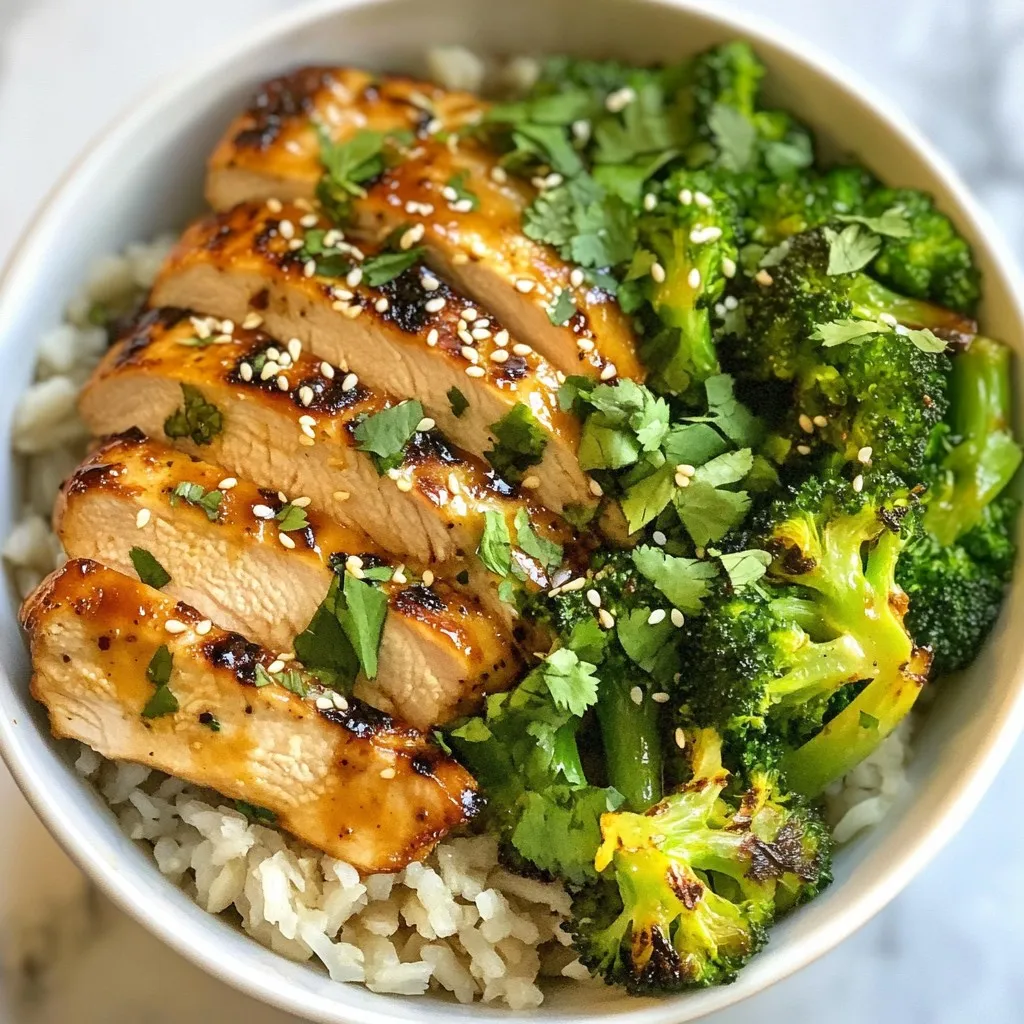 Lastly, sprinkle sesame seeds on each bowl and add fresh cilantro or chopped green onions for garnish. Enjoy your delicious Grilled Chicken and Broccoli Bowls!