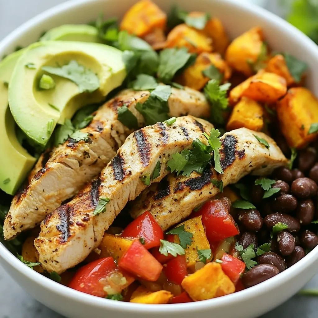 A delicious and healthy bowl featuring grilled chicken, sweet potatoes, black beans, and fresh toppings.