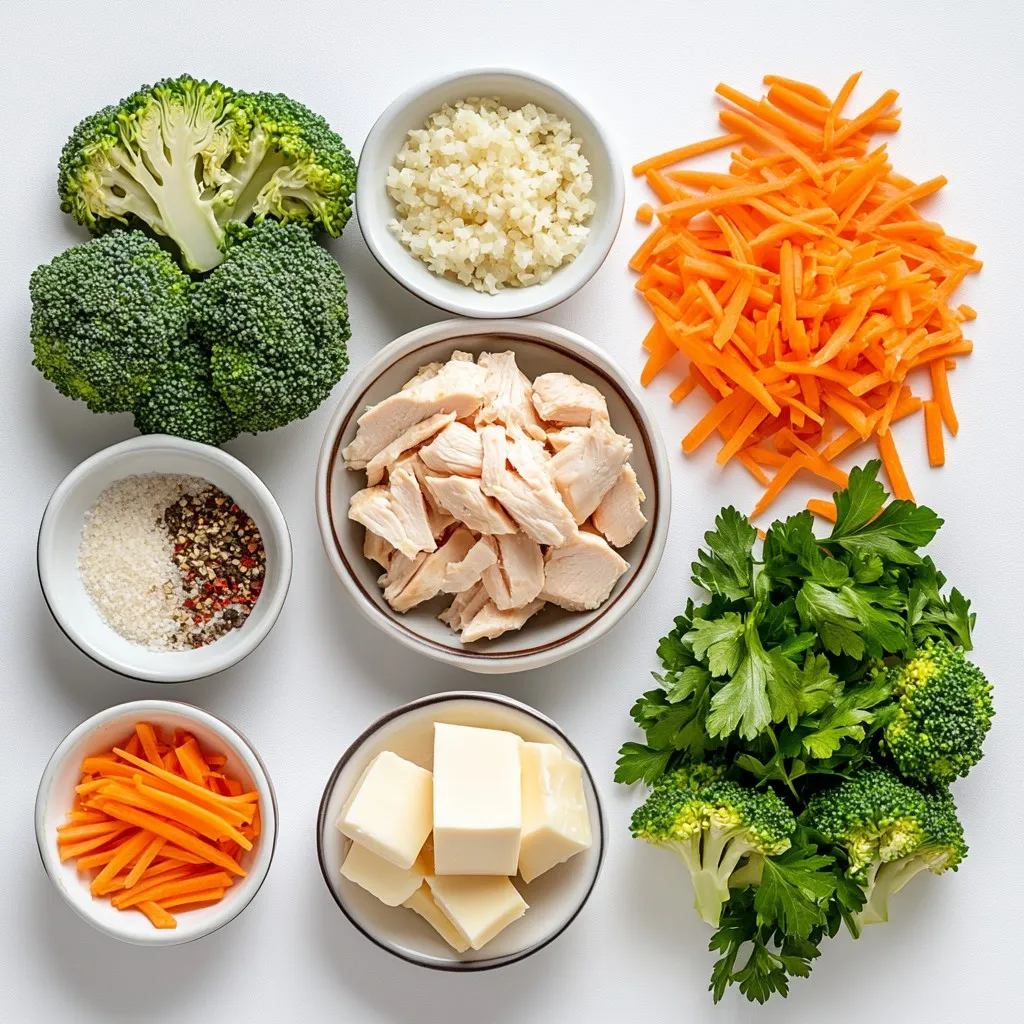 In a large bowl, combine the cooked chicken with cauliflower rice, steamed broccoli, shredded carrots, and chicken broth. Make sure to mix everything well. This helps all the flavors blend together. Then, gently fold in the softened cream cheese. This will add a creamy texture to your dish.