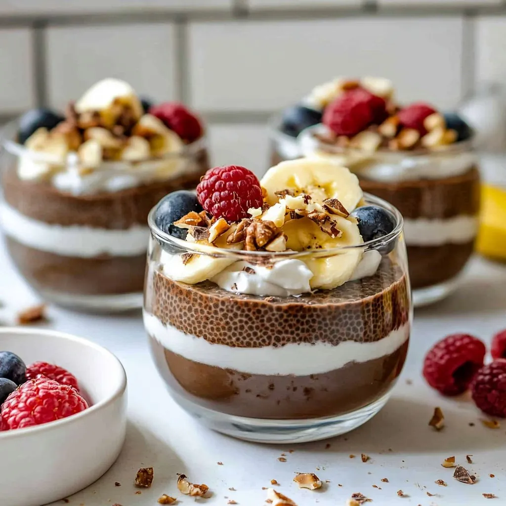 For a stunning presentation, layer the chocolate chia pudding with toppings in clear jars.