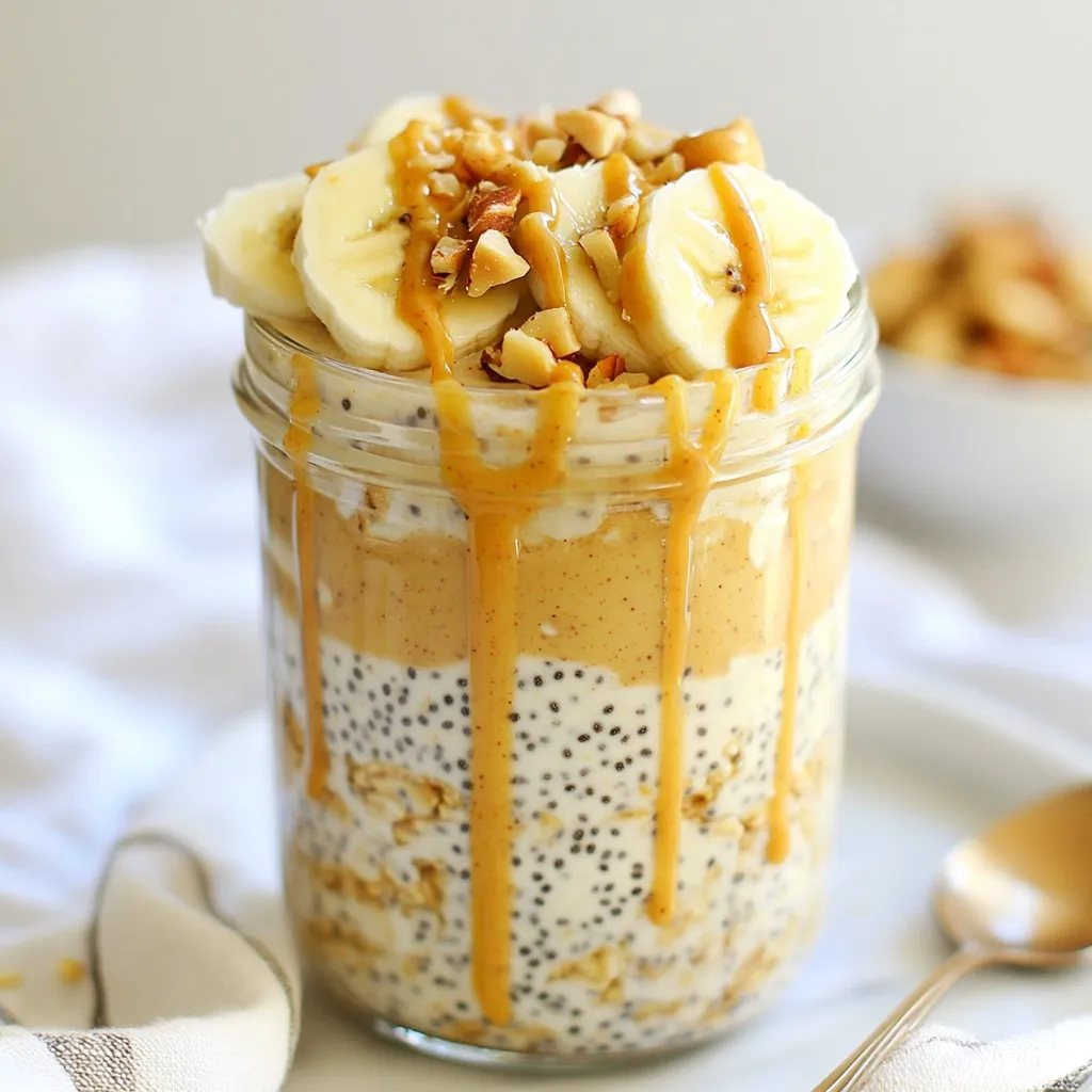 Serve your overnight oats in individual bowls or jars. Top generously with fresh banana slices, a drizzle of peanut butter for extra flavor, and a sprinkle of chopped nuts for added texture.