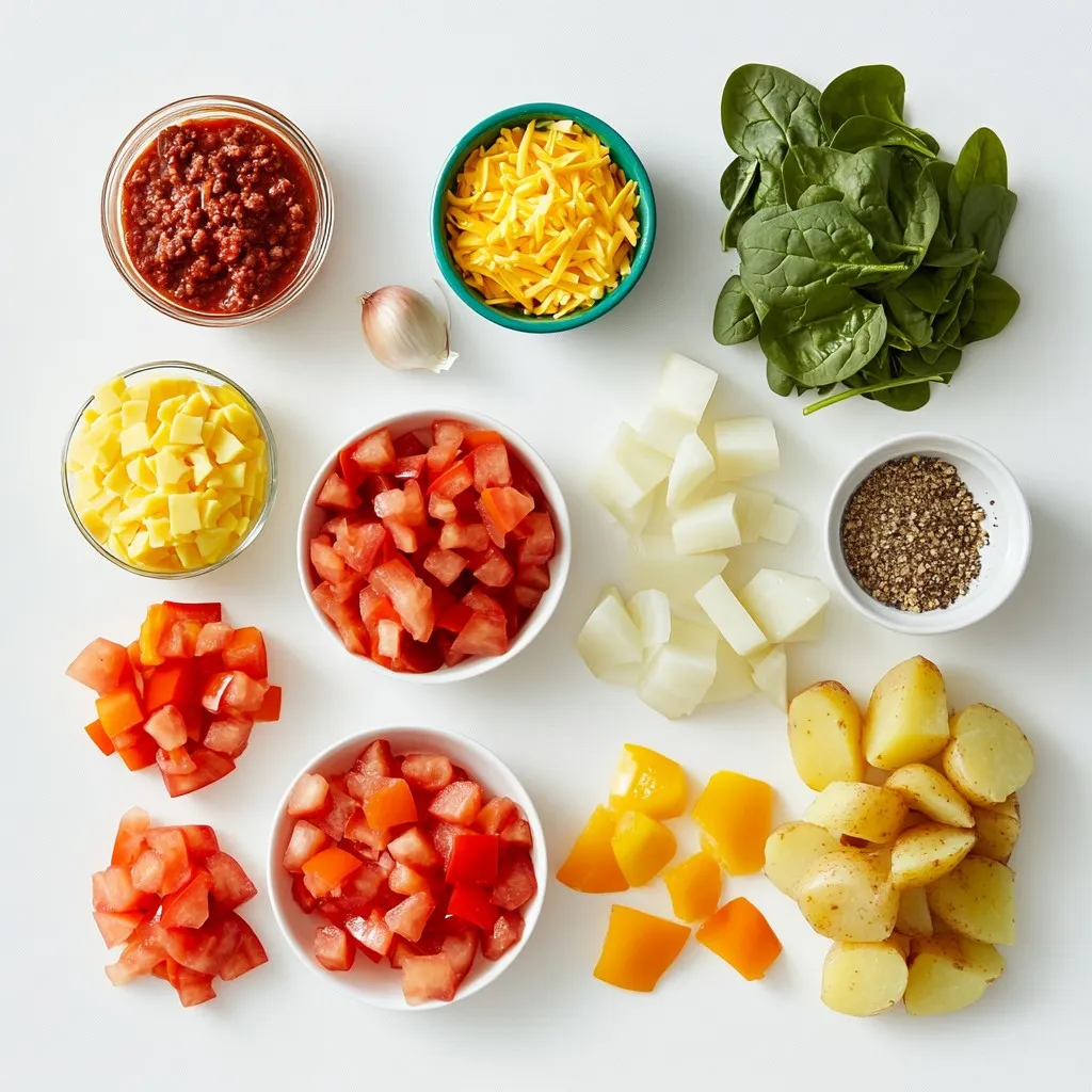 Mix in the diced bell peppers and cook for another 2-3 minutes. You want them to soften a bit. Stir in the chopped spinach, undrained diced tomatoes, Worcestershire sauce, smoked paprika, and oregano. Season with salt and pepper. Cook this for 2 more minutes to let the flavors blend.