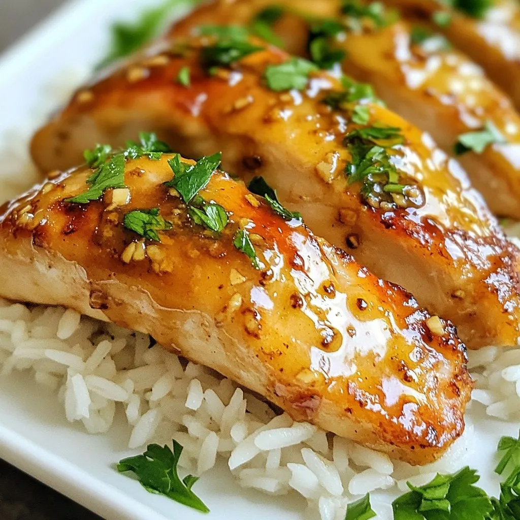 A flavorful dish featuring marinated chicken breasts served over jasmine rice, drizzled with a honey mustard sauce.