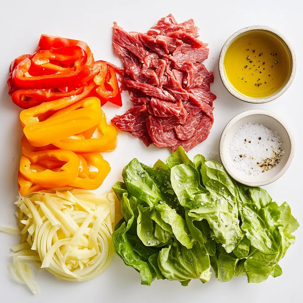 These ingredients come together to create a delicious dish. The bell pepper adds color and crunch. The onion brings sweetness. Thinly sliced beef gives it heartiness. Cream cheese makes it creamy, while provolone cheese provides that melty goodness. Olive oil helps cook the veggies, and garlic powder adds flavor. Salt and pepper round it all out. Finally, large lettuce leaves act as the perfect wrap. They keep everything together and add a fresh bite.