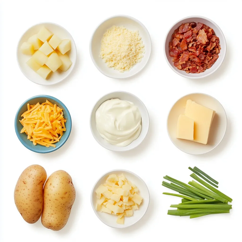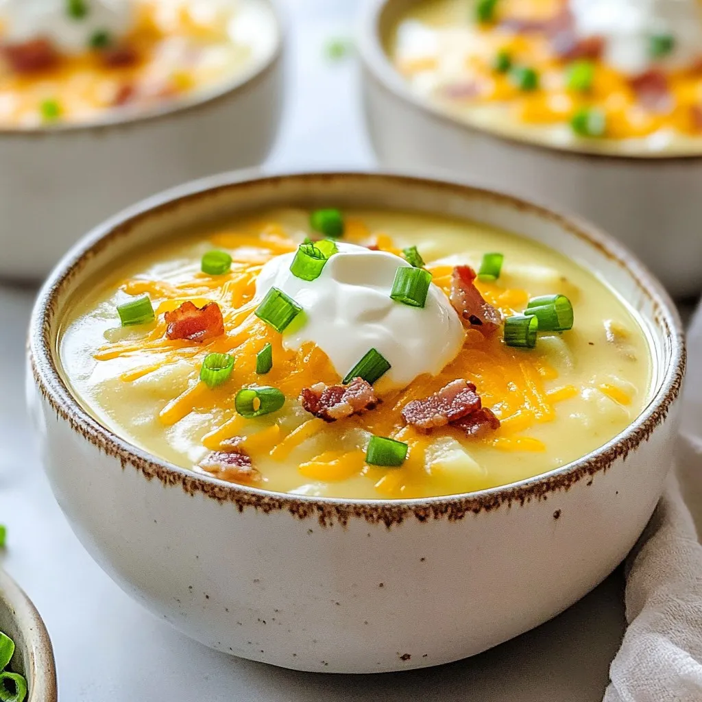 - 4 large russet potatoes, peeled and cut into 1-inch cubes - 1 medium onion, finely diced - 3 cloves of garlic, minced - 4 cups vegetable broth - 1 cup heavy cream - 1 cup shredded cheddar cheese - 1/2 cup sour cream - 4 slices turkey bacon, crumbled (optional) - 1/4 cup green onions, chopped - Salt and pepper, to taste - 2 tablespoons unsalted butter - 1 teaspoon smoked paprika When I make Loaded Baked Potato Soup, I focus on fresh, quality ingredients. The russet potatoes give a creamy texture that makes this soup a delight. I peel and cube them into 1-inch pieces for even cooking. Onions and garlic add depth to the flavor. I finely dice the onion for a sweet, soft base. The minced garlic brings a nice punch that mixes well with the broth. For the broth, I use vegetable broth as it adds richness without overpowering the potato flavor. The heavy cream is key for that creamy finish. I also mix in sour cream for tang and extra creaminess. Cheddar cheese is a must. I love using the sharp kind because it melts perfectly and adds a wonderful taste. If you enjoy bacon, crumbled turkey bacon gives that smoky touch. Green onions make a great garnish. They add a pop of color and fresh taste. Always season with salt and pepper to enhance all the flavors. Finally, unsalted butter and smoked paprika round out the dish. The butter helps with sautéing, and the paprika adds a warm, smoky hint. These ingredients come together to create a cozy, comforting soup you’ll love. {{ingredient_image_2}} - Sauté onion and garlic in butter - Add potatoes and vegetable broth To start, take a large pot and melt two tablespoons of unsalted butter over medium heat. Once it's hot, add one finely diced onion and three minced garlic cloves. Stir them around for about five minutes. You want the onion soft and clear. Now, add four large russet potatoes, cut into one-inch cubes. Pour in four cups of vegetable broth. This mix is where the magic begins. - Simmer until potatoes are tender - Purée soup to desired consistency Bring the pot to a rolling boil. Once it boils, lower the heat to let it simmer. Let it bubble gently for about 15 to 20 minutes. You’ll know it’s done when the potatoes are fork-tender. Next, use an immersion blender to purée the soup. You can blend it until smooth or leave some chunks. It’s up to your taste. - Stir in cream, cheese, sour cream, and paprika - Add crumbled bacon and season to taste Once you have the right texture, it’s time to add creaminess! Stir in one cup of heavy cream, one cup of shredded cheddar cheese, and half a cup of sour cream. Don’t forget one teaspoon of smoked paprika for a nice smoky flavor. Let it simmer gently for another five to ten minutes. Finally, fold in four slices of crumbled turkey bacon if you want. Season with salt and black pepper to make it perfect. Serve hot and enjoy every creamy bite! How to choose the best potatoes for soup When picking potatoes, look for russets. They are starchy and creamy. Choose ones without blemishes or dark spots. Fresh potatoes will give your soup a nice texture. Importance of sautéing onions Sautéing onions brings out their sweet flavor. Cook them in butter until soft. This step adds depth to your soup. It also makes your kitchen smell amazing! Achieving the perfect soup consistency You want a creamy soup, but some chunkiness is good too. Start by blending half the soup. This keeps some potato pieces for texture. If you like it smooth, blend all of it. Tips on blending for chunkiness vs. creaminess Use an immersion blender for easy blending. If you want a creamy soup, blend longer. For more chunks, blend just a little. Adjust to your taste. Recommended spices to elevate flavor Add smoked paprika for a warm, smoky taste. A pinch of pepper adds heat. These spices make your soup richer. Don’t forget to taste and adjust as you go! Suggestions for garnishing the soup Top your soup with green onions and extra cheese. A dollop of sour cream adds creaminess. You can also sprinkle bacon bits for crunch. This makes the soup look and taste better! Pro Tips Choose the Right Potatoes: For the best texture and flavor, use russet potatoes as they provide a fluffy and creamy base for the soup. Enhance the Flavor: Consider adding a splash of white wine or a dash of Worcestershire sauce while cooking to deepen the soup's flavor profile. Texture Control: If you prefer a creamier soup, blend all of the potatoes. For a heartier version, blend just half and leave chunks for added texture. Garnish Creatively: Experiment with different toppings like crispy shallots, fresh herbs, or a drizzle of olive oil to elevate your soup presentation. {{image_4}} You can easily make Loaded Baked Potato Soup fit your diet. For gluten-free options, just check your broth label. Most vegetable broths are gluten-free, so you're good to go. If you're vegetarian or vegan, swap the heavy cream for coconut milk or cashew cream. Use plant-based cheese, too. It will still taste great! Adding different types of cheese can make this soup even better. Try gouda or pepper jack for a fun twist. You can also mix in some grated parmesan for a salty kick. If you want more nutrition, add vegetables. Chopped kale or spinach works well. You can stir them in at the end for a pop of color and flavor. Pairing your soup with crusty bread or a fresh salad makes a great meal. The bread soaks up the soup. It’s perfect for dipping! For gatherings, consider serving the soup in small cups. This way, guests can easily enjoy a taste. You can also set up a toppings bar. Let everyone add their own green onions, cheese, or bacon. This adds fun to your meal! To keep your leftover soup fresh, use an airtight container. Glass or plastic containers work well. Make sure to let the soup cool to room temperature. This step helps prevent condensation. Once cooled, seal the container tightly. Label it with the date so you know when to use it. You can reheat your soup in two ways: microwave o