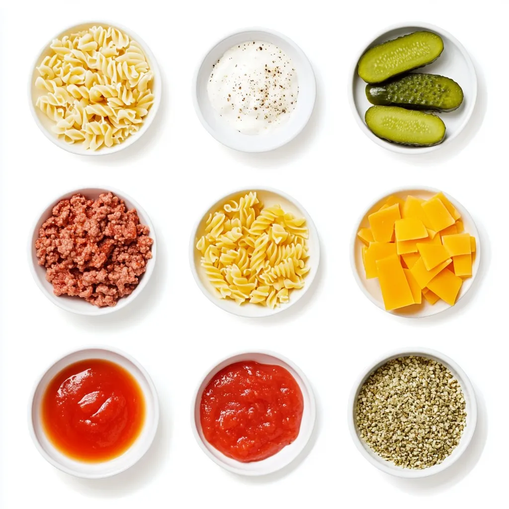 - Pasta options: You can choose between elbow macaroni or rotini pasta. Elbow macaroni is small and easy to eat. Rotini has twists that hold sauce well, making every bite tasty. - Recommended beef blend for flavor: I suggest using an 80/20 ground beef blend. This mix has 80% lean meat and 20% fat. The fat adds great flavor and keeps the beef juicy. - Additional seasonings and their roles: You will need onion powder and garlic powder. These spices add depth to the dish. Salt and black pepper enhance all the flavors. Don't forget the diced tomatoes and beef broth for a rich base. Lastly, cream cheese, cheddar, and mozzarella create a creamy texture. The dill pickles, mustard, and ketchup give that classic cheeseburger taste. {{ingredient_image_2}} To cook the pasta, start by boiling salted water. Once it bubbles, add the elbow macaroni or rotini. Follow the package instructions, but aim for al dente. This means the pasta should be firm but not hard. After cooking, drain the pasta in a colander. Rinsing is not needed, as the starch helps the sauce stick. For the beef, use medium heat. This heat level helps the meat cook evenly. Add the ground beef to the pot after draining the pasta. Break it apart with a spatula as it cooks. Make sure to crumble it well for even cooking. Cook until it is no longer pink, about 5-7 minutes. After browning, drain any excess fat to keep the dish from being greasy. Once you brown the beef, it's time to add flavor. Sprinkle onion powder, garlic powder, salt, and pepper over the meat. Stir well so that the spices mix in. Next, add diced tomatoes and beef broth. Stir again and let it simmer for 2-3 minutes. This allows the flavors to blend nicely. Now, lower the heat to a gentle simmer. Add the softened cream cheese next. Stir constantly until it's melted. Then, mix in the shredded cheddar and mozzarella. This creates a creamy sauce. Finally, gently fold in the drained pasta. Make sure every piece gets coated in that cheesy goodness. Add diced pickles, yellow mustard, and ketchup last. Stir well to combine everything. This step adds a tangy twist that makes it taste just like a cheeseburger! For seasoning, you can swap onion powder for fresh onions. Fresh onions give a nice crunch and flavor. If you like garlic, fresh minced garlic works well too. To enhance the cheese sauce, add a splash of Worcestershire sauce. It adds a rich umami taste that makes each bite special. When melting cheese, keep the heat low. High heat can cause the cheese to clump. Stir it slowly until smooth. To avoid a greasy dish, drain the excess fat after cooking the ground beef. This keeps your pasta creamy, not oily. Garnish your loaded cheeseburger pasta with chopped green onions. They add color and freshness. For family meals, serve in large bowls with a side salad. This makes it easy for everyone to dig in and enjoy. Pro Tips Choose the Right Pasta: Opt for elbow macaroni or rotini to better hold the creamy sauce and meat mixture, ensuring every bite is flavorful. Ingredient Temperature: Make sure the cream cheese is at room temperature before adding it to the pot for easier melting and a smoother sauce. Mix Up the Cheeses: Feel free to experiment with different cheeses, like pepper jack for a spicy kick or gouda for a smoky flavor. Add Fresh Herbs: Consider adding chopped fresh herbs like parsley or chives at the end for an extra layer of flavor and freshness. {{image_4}} You can change proteins in this dish. Use ground turkey for a leaner option. If you want a vegetarian twist, try lentils or a meat substitute. They work well and keep the meal hearty. For cheese lovers, consider dairy-free cheese. Many brands offer great options. This keeps the taste while catering to different diets. Adding veggies can boost nutrition and taste. Chop bell peppers, spinach, or zucchini. These veggies add color and crunch. They fit right in with the pasta and beef. If you like heat, consider adding jalapeños or crushed red pepper. This gives your dish a spicy kick. Adjust the amount based on your taste. For a fun twist, try baked cheeseburger pasta. Just mix your ingredients in a baking dish. Top with more cheese and bake until bubbly. This adds a crispy layer on top that everyone loves. You can also make this a one-pot meal. Cook your pasta, beef, and sauce in one pot. This cuts down on clean-up time. Plus, it keeps all the flavors together. To keep your loaded cheeseburger pasta fresh, use airtight containers. Glass or plastic containers with tight lids work best. This helps prevent air and moisture from spoiling your meal. You can store it in the fridge for up to three days. Make sure the pasta is cool before sealing the container. This keeps it from getting soggy. When reheating, you want to keep that creamy goodness. The best way is to use a skillet on low heat. Add a splash of beef broth or water to help bring back the creaminess. Stir well to mix everything. If you want to refresh your leftovers, add a little extra cheese or pickles. This brings back flavor and adds a fun twist. You can also toss in some fresh herbs for a burst of color. Enjoy your delicious comfort food again! Can I use whole wheat or gluten-free pasta? Yes, you can use whole wheat or gluten-free pasta. Both options work well in this recipe. Whole wheat pasta adds fiber and nutrients. Gluten-free pasta gives those with gluten sensitivity a tasty choice. How can I make this pasta dish spicier? To spice it up, add red pepper flakes or diced jalapeños. You can also use spicy mustard instead of yellow mustard. These changes will give the dish a nice kick without losing its cheeseburger flavor. Caloric information per serving Each serving of loaded cheeseburger pasta has about 600 calories. This number can vary based on the cheese and beef you choose. Always check the product labels for precise details. Tips for making it lighter or healthier To make this dish lighter, swap ground beef for turkey or chicken. Use low-fat cheese and 
