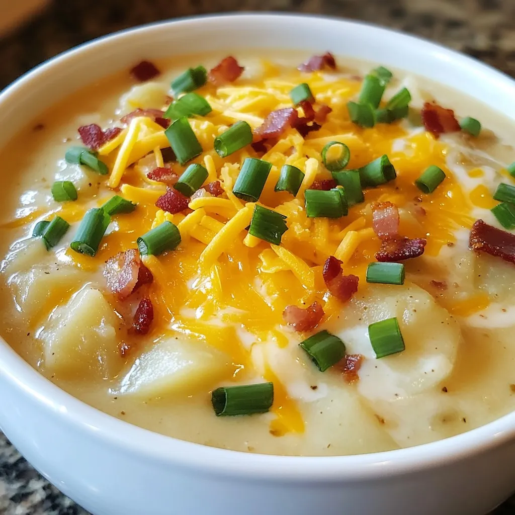 A creamy and hearty potato soup loaded with cheese, bacon, and topped with green onions.