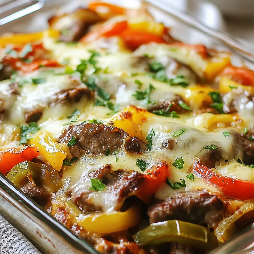 - 1 lb thinly sliced sirloin steak - 1 tablespoon olive oil - 1 medium onion, thinly sliced - 1 medium green bell pepper, thinly sliced - 1 medium red bell pepper, thinly sliced - 2 cloves garlic, minced The main ingredients create a rich base for this casserole. Thinly sliced sirloin steak gives it a hearty feel. The olive oil adds flavor and helps cook the beef perfectly. Onions and bell peppers bring sweetness and color. Garlic adds depth to the taste. - 1 teaspoon salt - 1/2 teaspoon black pepper - 1 teaspoon smoked paprika - 1 cup heavy cream - 1 1/2 cups shredded provolone cheese, divided - 1 cup shredded mozzarella cheese The seasoning blends perfectly with the meat and veggies. Salt and black pepper enhance the flavors. Smoked paprika gives a nice smoky touch. The heavy cream makes the dish creamy and rich. Provolone and mozzarella cheese create a delicious cheesy topping. - Fresh parsley Fresh parsley brightens the dish. It adds a pop of color and freshness. A sprinkle before serving makes the casserole look appealing. This simple touch elevates the meal and makes it more inviting. {{ingredient_image_2}} - Preheat your oven to 350°F (175°C). This warms it for baking. - In a large skillet, add 1 tablespoon of olive oil. Heat it over medium-high heat. Once hot, add 1 lb of thinly sliced sirloin steak. Sauté for 3-4 minutes until browned. Remove the steak and set it aside. - In the same skillet, add 1 medium onion, 1 medium green bell pepper, and 1 medium red bell pepper, all sliced. Sauté these for 5-7 minutes until they soften and caramelize. - Then, add 2 minced garlic cloves. Cook for 1 more minute until the garlic smells great. - In a bowl, whisk 1 cup of heavy cream with ¾ cup of shredded provolone cheese until smooth. - Grease a 9x13 inch casserole dish. Layer the steak and veggies evenly in the dish. Pour the cream mixture over this, covering it all. - Sprinkle the remaining ¾ cup of provolone cheese and 1 cup of shredded mozzarella cheese on top. - Place the casserole in your preheated oven. Bake for 25-30 minutes until the cheese is melted and bubbly. - After baking, let it cool for a few minutes. Just before serving, add fresh chopped parsley for color and freshness. - Best way to sauté steak: Start with a hot skillet. Add olive oil and let it heat. Place the steak in a single layer. Avoid crowding the pan. Cook for 3-4 minutes until browned. This keeps the steak juicy. - Tips for perfectly caramelized vegetables: Use medium-high heat. Sauté onions and bell peppers until soft. Stir them often for an even cook. Add garlic at the end to prevent burning. This gives a sweet, rich flavor. - Optimal cheese melting methods: Use a mix of provolone and mozzarella. Layer the cheeses on top of the casserole. Bake until bubbly and golden. This creates a creamy texture that everyone loves. - Cheese alternatives for different flavors: Try cheddar for a sharp taste. Gouda adds a smoky flavor. Experiment to find your favorite cheese combo. Each will change the dish's character. - Ideal side dishes: Serve with a crisp green salad. Roasted veggies are another good choice. They balance the richness of the casserole. - Presentation tips for a flavorful look: Serve in individual portions for a nice touch. Garnish with fresh parsley. This adds color and freshness. A bright plate makes the dish more inviting. Pro Tips Choose the Right Cut: Opt for thinly sliced sirloin for the best tenderness and flavor. You can also ask your butcher to slice it for you. Vegetable Variations: Feel free to add other vegetables such as mushrooms or zucchini for added flavor and texture. Make It Ahead: Prepare the casserole in advance and refrigerate it. Just bake it when you’re ready to serve for a quick meal. Garnish for Freshness: A sprinkle of fresh parsley not only adds color but also enhances the flavor profile of the dish. {{image_4}} You can easily change the proteins in this dish. Try using chicken or turkey instead of sirloin steak. They will still taste great. For cheese, think outside the box. Cheddar or gouda can add new flavors. Both melt nicely and give a unique twist to the casserole. If you want to add a pasta-like texture, use zucchini or spaghetti squash. They are great low-carb options. You can also try cauliflower rice for a hearty base. It adds volume without the carbs. This way, your dish stays filling and healthy. For those who enjoy heat, adding jalapeños brings a nice kick. You can slice them up and mix them in with the veggies. If you want a different flavor, try Italian herbs. Oregano or basil can change the taste profile and make it even more exciting. To keep your low-carb Philly cheesesteak casserole fresh, follow these steps: - Refrigeration: Store the casserole in an airtight container. It stays good for up to 4 days in the fridge. Make sure it cools down before sealing. - Freezing: For longer storage, freeze the casserole. Use a freezer-safe container or wrap it tightly in plastic wrap. It can last for up to 3 months in the freezer. Thaw it overnight in the fridge before reheating. To enjoy your casserole's creamy cheese again, use these reheating methods: - Oven: Preheat the oven to 350°F (175°C). Cover the casserole with foil to keep the cheese from drying out. Bake for about 20 minutes or until heated through. - Microwave: If you’re short on time, the microwave works too. Heat in short bursts at medium power. Stir between intervals to ensure even heating and keep the cheese creamy. Using these storage and reheating tips helps you enjoy this delicious dish even days later. Is it possible to make this recipe dairy-free? Yes, you can make this dish dairy-free. Swap heavy cream for coconut cream. Use dairy-free cheese instead of provolone and mozzarella. This still gives you creaminess and flavor without dairy. Can I use pre-cooked steak for this casserole? Absolutely! Pre-cooked steak works well. Just heat it in the skillet briefly before adding vegetables. This sa