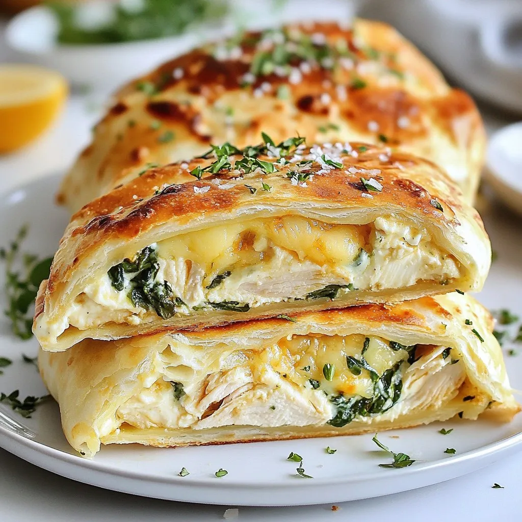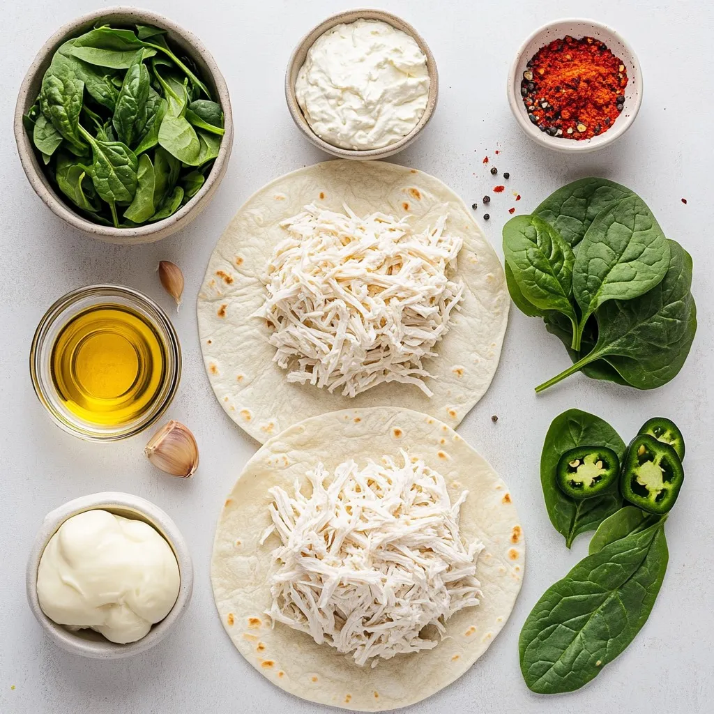 - 2 cups cooked chicken, shredded - 1 cup shredded mozzarella cheese - 1 cup softened cream cheese - 3 cloves garlic, minced - 1 teaspoon dried oregano - 1 teaspoon paprika - 4 large tortilla wraps - 1 cup fresh spinach leaves - 1 tablespoon olive oil - Salt and pepper, to taste - Optional: Sliced jalapeños for a spicy kick Gather all these ingredients before you start. This makes cooking easier and more fun. You want your chicken to be shredded nicely. Use rotisserie chicken for quick prep. The cream cheese adds a rich, creamy texture. Mozzarella gives you that melty goodness. Garlic brings a nice punch of flavor. If you enjoy heat, sliced jalapeños are a great addition. Just remember to adjust the amount based on your taste. Fresh spinach adds color and nutrition. It wilts perfectly in the skillet, which keeps the wrap light. Use good-quality tortillas for the best results. They should be large enough to hold all the filling. Make sure to have salt and pepper ready for extra seasoning. Fresh herbs for garnish add a nice touch when serving. With these ingredients, you set yourself up for a delicious meal. {{ingredient_image_2}} - In a large bowl, combine the shredded chicken, mozzarella, and cream cheese. - Add the minced garlic, oregano, paprika, salt, and pepper. - Stir well to coat each piece. This ensures every bite is packed with flavor. - Heat a non-stick skillet over medium heat and add the olive oil. - Once warm, add the fresh spinach leaves. - Sauté for about 30 seconds. This keeps the spinach bright and tasty. - Take a tortilla and place about 1/2 cup of the chicken mixture in the center. - If you like spice, add a few slices of jalapeños. - Fold the sides of the tortilla in, then roll tightly from the bottom up. This seals the filling inside. - Place the wraps seam-side down in the hot skillet. - Cook for about 3-4 minutes on each side. - Look for a golden brown color and melted cheese to know they’re ready. - After cooking, let the wraps rest for a minute. - Slice each wrap in half diagonally for serving. - For a nice touch, arrange them on a board and garnish with fresh herbs. Enjoy with a spicy dip or salsa! - Do use fresh ingredients. Fresh chicken and cheese boost flavor. - Don’t skip the garlic. It adds a rich, savory taste. - Do check your tortillas. Look for large, soft ones for easy wrapping. - Don’t overfill the wraps. Keep the filling balanced for tight rolls. - Try adding Italian seasoning for extra depth. - Fresh herbs, like basil or cilantro, can brighten the dish. - Serve with spicy salsa or ranch dip for a tasty twist. - Guacamole pairs great, adding creaminess. - You can grill the wraps for a smoky flavor. - Bake them in the oven at 375°F for about 15 minutes. - Adjust cooking times: thinner wraps cook faster. - Always watch for that golden brown color for perfect crunch. Pro Tips Perfectly Shredded Chicken: For the best flavor and texture, use leftover rotisserie chicken or poach your chicken breasts in seasoned broth for added depth. Cheese Variations: Experiment with different cheeses like cheddar or pepper jack for a unique twist on the classic flavor while keeping it melty. Wrapping Technique: Ensure the filling is evenly distributed and don’t overfill to avoid spillage while rolling your wraps tightly. Resting Period: Allowing the wraps to rest for a minute after cooking helps the cheese set slightly, making them easier to slice and serve. {{image_4}} You can swap out cheeses for different flavors in your Melty Garlic Chicken Cheese Wraps. Here are some ideas: - Use gouda or cheddar for a bolder taste. - Try cream cheese with herbs for a fresh twist. - For a lighter option, consider ricotta cheese. If you want to change the protein, here are some tasty substitutes: - Turkey offers a leaner alternative to chicken. - Tofu works well for a plant-based option. - Use cooked shrimp for a seafood version. For those needing gluten-free options, look for these tortillas: - Corn tortillas are a great choice for a gluten-free wrap. - Check the labels on store-bought wraps for gluten-free options. If you want to make a vegan version, consider these swaps: - Use vegan cream cheese instead of regular. - Replace chicken with jackfruit for a meaty texture. - Choose plant-based cheese to keep it dairy-free. You can jazz up your wraps with different spices or sauces. Here are some fun ideas: - Add chili powder for a smoky kick. - Try Italian seasoning for a fresh herb flavor. - Use buffalo sauce for a spicy twist. Feel free to add more veggies for extra crunch and nutrition: - Bell peppers give a nice color and taste. - Onions add sweetness when sautéed. - Mushrooms lend a hearty texture to the filling. Experiment with these variations to make the wraps your own! To keep your Melty Garlic Chicken Cheese Wraps fresh, store them in an airtight container. Place a piece of parchment paper between each wrap to prevent sticking. Refrigerate them right away. They stay good for about 3 days in the fridge. To maintain freshness, avoid adding any sauces or dips until you are ready to eat. This keeps the wraps from getting soggy. When reheating, you want to keep that melty cheese and crispy wrap. The best methods are using a skillet or an oven. For a skillet, heat it over medium-low heat. Place the wrap in the skillet and cover it. Heat for about 3-4 minutes on each side until warm. If using an oven, preheat it to 350°F (175°C). Wrap the cheese wraps in foil to keep them moist. Bake for about 10-15 minutes. This way, the wrap stays crisp, and the cheese melts perfectly. If you want to freeze your wraps, make sure they are completely cool first. Wrap each one in plastic wrap and then place them in a freezer bag. Remove as much air as possible to prevent freezer burn. When you are ready to eat, take them out of the freezer and let them thaw in the fridge overnight. For quick thawing, you can use the microwave for about 2-3 minutes on the defrost setting. After thawing
