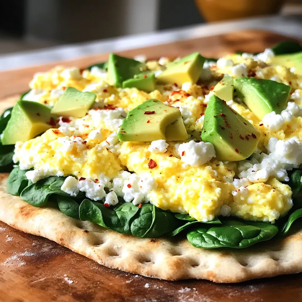 Start with the whole wheat flatbread as your base. Spread the cottage cheese evenly across the top. This creamy layer adds richness and helps hold everything together. Next, place tightly packed baby spinach on the cheese. Follow with the fluffy scrambled eggs. Finally, sprinkle crumbled feta over the eggs. Layering this way builds flavor and texture, making each bite more enjoyable.